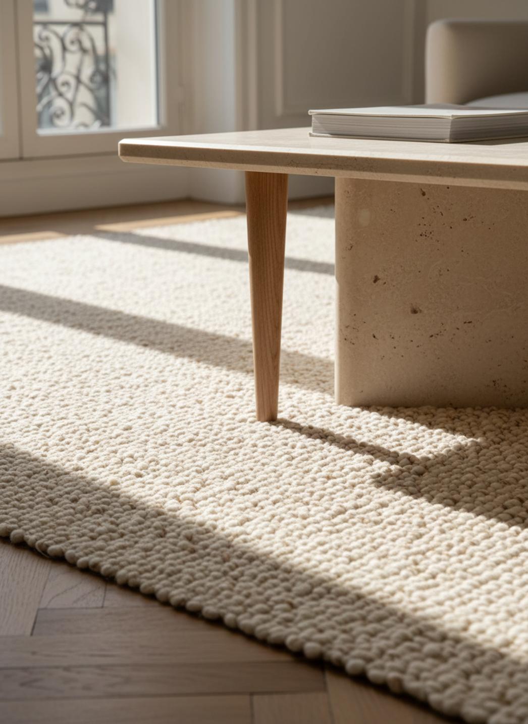 Pensé pour dialoguer avec des matériaux naturels tels que le bois clair, le lin et le rotin, ce tapis instaure une atmosphère cosy et raffinée. Il modernise un salon nordique, adoucit une chambre lumineuse et accompagne un bureau épuré, tout en conservant une présence légère qui respire.