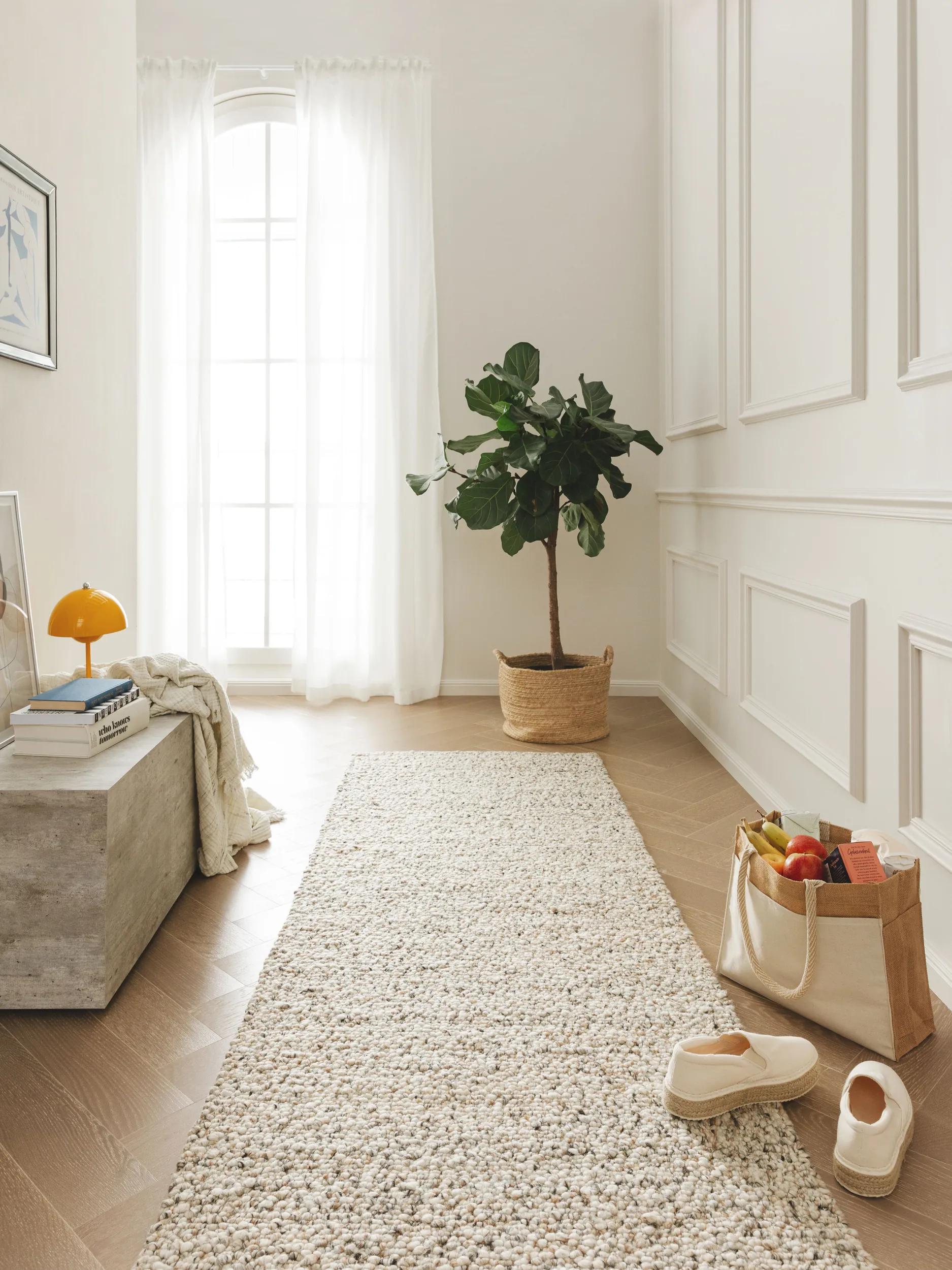 La matière révèle une présence tactile mesurée, pensée pour une sensation accueillante au quotidien. La richesse de la laine apporte une densité douce sous le pas, tandis que la teinte marron clair évoque les fibres naturelles et réchauffe sans alourdir, en harmonie avec un intérieur clair et boisé.