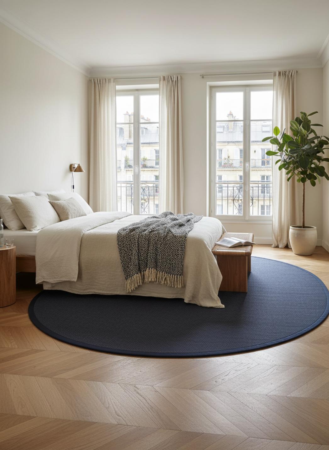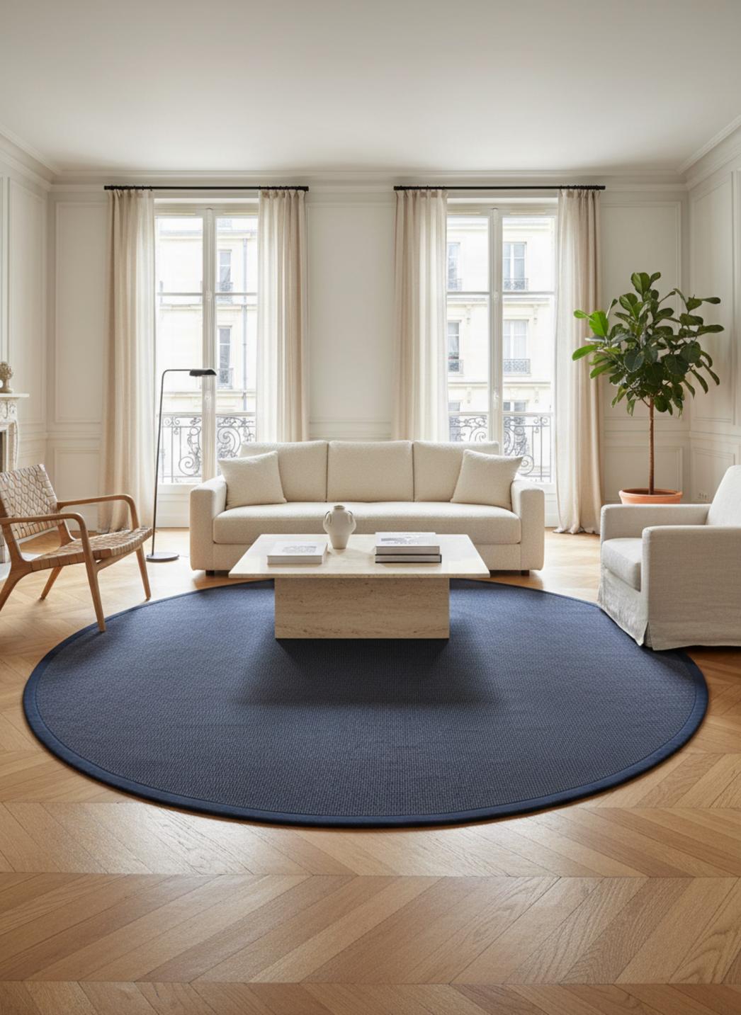 Tapis scandinave rond bleu foncé en sisal 150 cm de diamètre