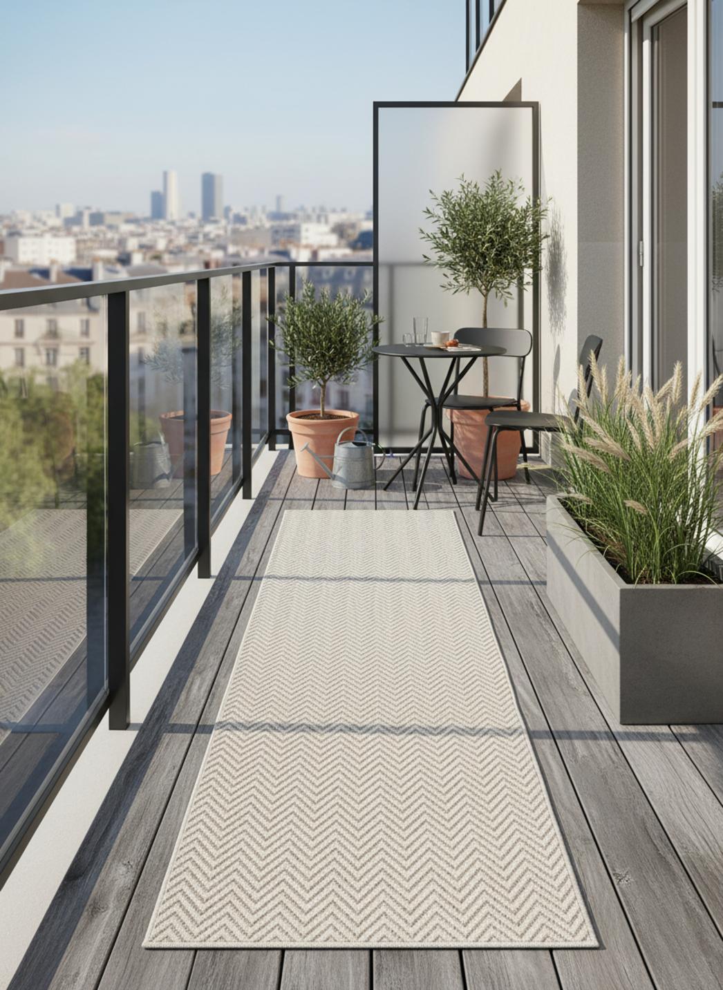 Le long d’un couloir ou sur un balcon lumineux, le tapis scandinave à tressage en pointe blanc apporte une touche de clarté et de raffinement discret. Son motif tissé en chevrons crée un mouvement subtil qui accompagne la circulation tout en adoucissant la perspective. La teinte blanche, pure et lumineuse, reflète la lumière naturelle et agrandit visuellement l’espace, insufflant une atmosphère sereine et équilibrée. En format 70x200 cm, il s’étire avec élégance dans les espaces étroits, reliant les zones de vie avec fluidité et harmonie. Ce modèle s’inspire de l’esthétique épurée de la gamme de tapis d’extérieur, où les matières tressées et les lignes nordiques se conjuguent pour créer des décors intemporels. Sa texture à plat révèle un jeu délicat de lumière et d’ombre, soulignant la finesse de son tissage. On retrouve cette même sensation de continuité et de légèreté dans la sélection de tapis de balcon, idéale pour habiller les passages d’une élégance sobre et naturelle. Un tapis qui guide le pas avec douceur et illumine le lieu d’une clarté apaisante.