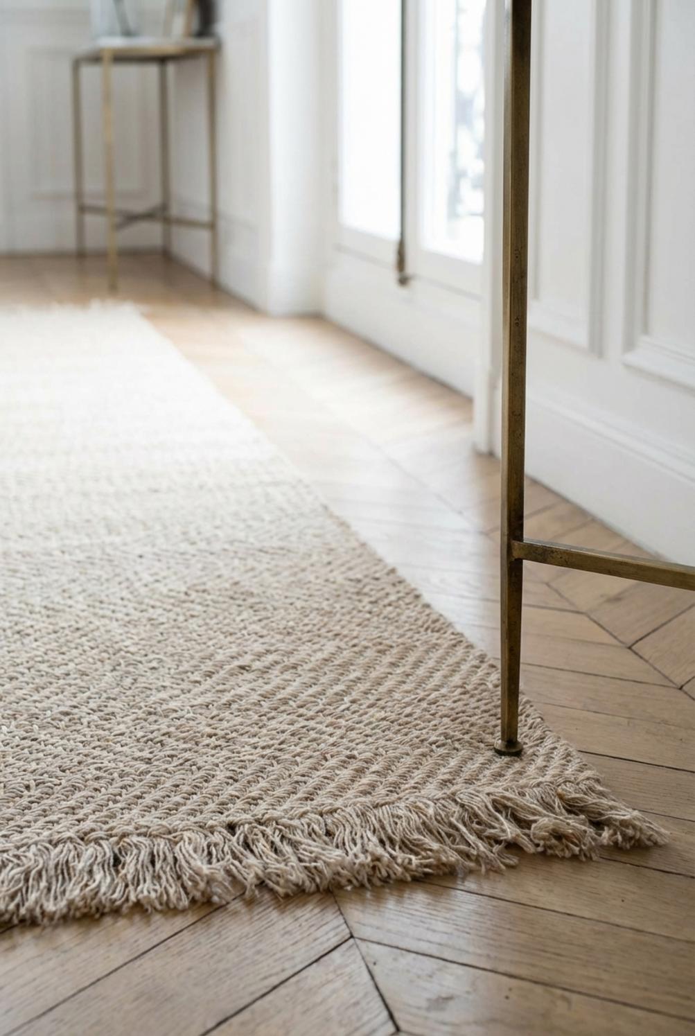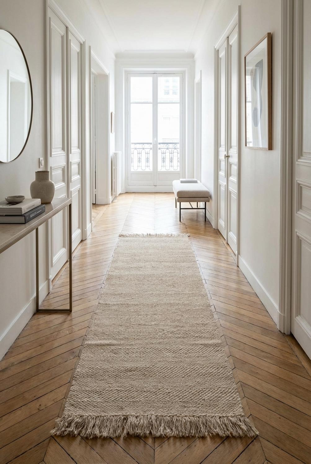 Sa présence réchauffe tout naturellement un couloir en apportant de la profondeur sans alourdir l’espace. Les lignes épurées du tressage gardent une lecture simple et graphique, tandis que les franges prolongent subtilement la perspective. Placé au centre d’une circulation, il invite au pas feutré et recentre le regard sur un trajet lumineux.