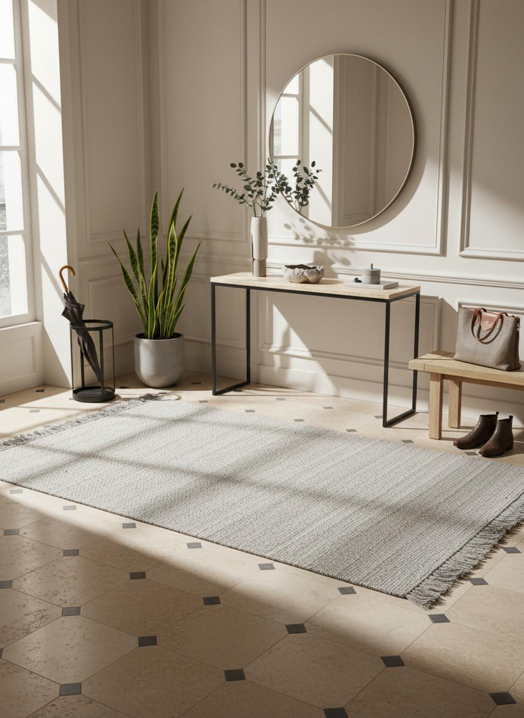 La texture évoque un tissage artisanal soigneux, légèrement sculptée par un travail tressé qui invite au toucher. Les franges ajoutent une fin touchée de poésie, comme un chuchotement au sol qui réchauffe un coin lecture ou adoucit la perspective d’un salon minimaliste.