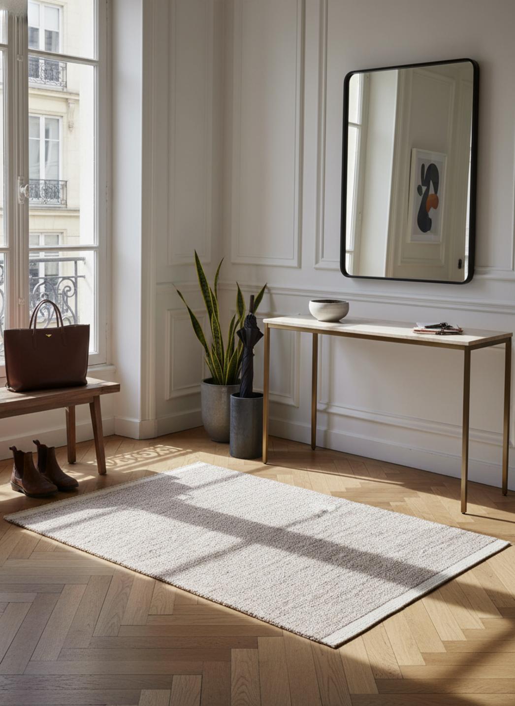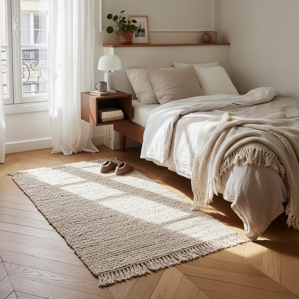Cette pièce trouve naturellement sa place dans une chambre lumineuse, un bureau épuré ou un séjour où le lin et le rotin dialoguent avec des surfaces mates. Le tapis adoucit les pas, réduit la sensation de froid et offre un point d’ancrage visuel, modulant la pièce sans la dominer.