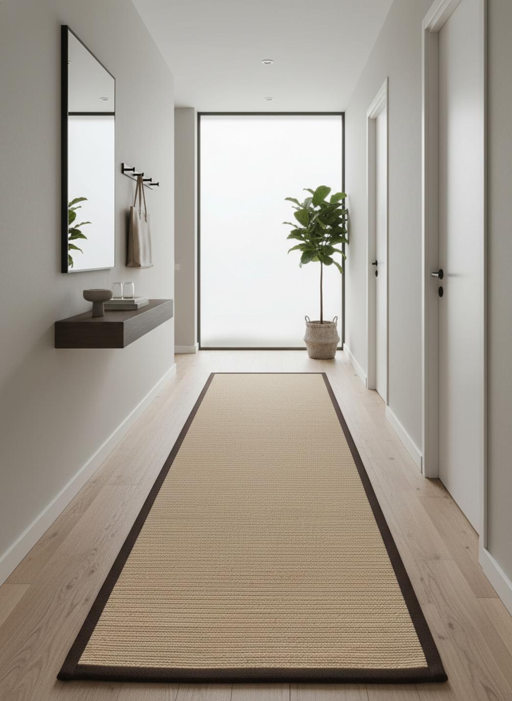 Pensé pour les passages, ce tapis de couloir structure l’espace sans alourdir la perspective et crée un fil conducteur doux le long d’un couloir étroit. Sa taille de 70x200 cm définit une zone de circulation, recentre l’ameublement léger et met en valeur une composition de meubles en bois clair et linge de maison neutre.