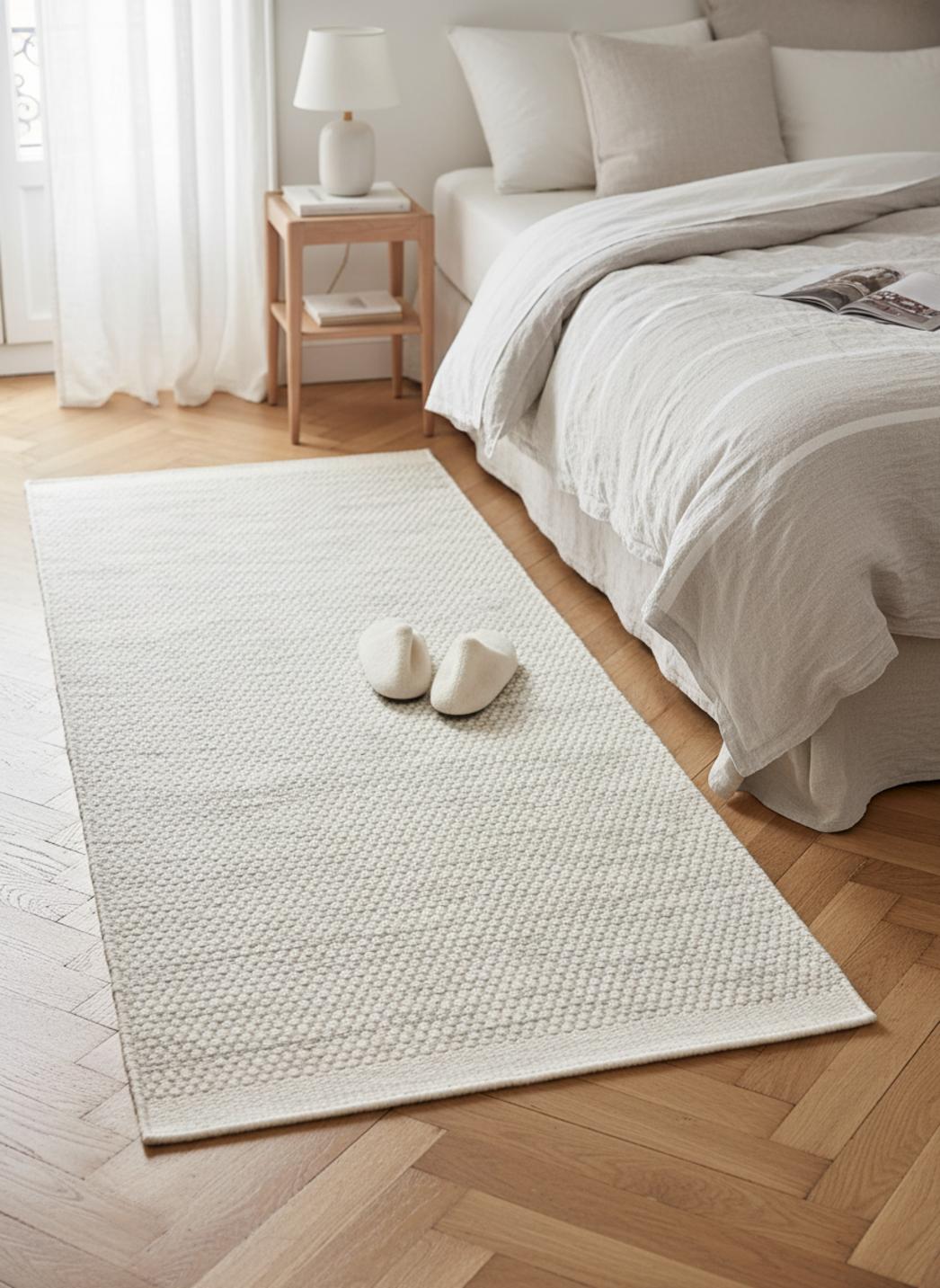 Tapis scandinave tressé descente de lit enfant crème et gris en laine 70x200 cm