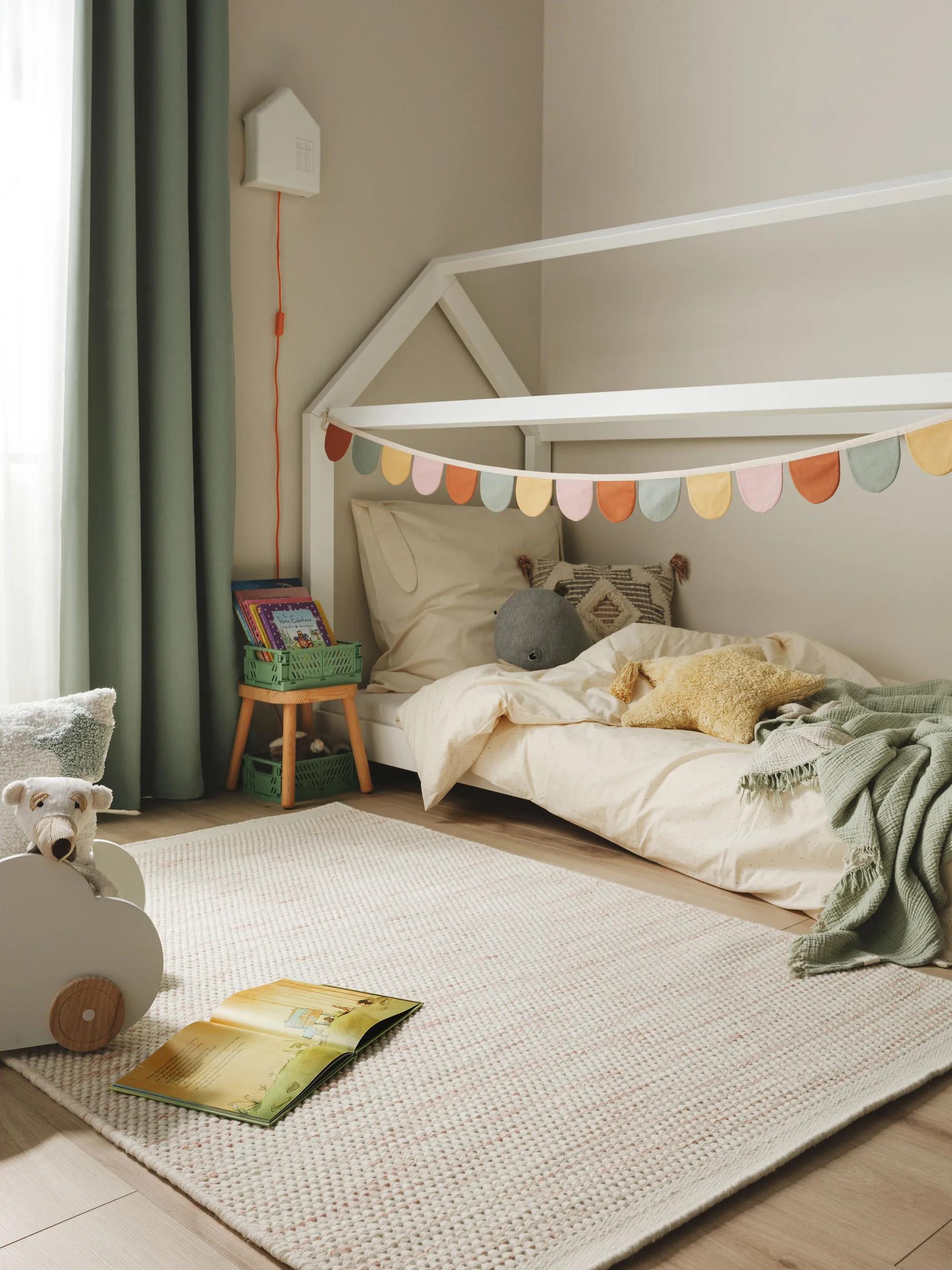 Le toucher est une promesse de tendresse, la surface invite à s’y allonger pour une sieste volée ou à s’asseoir pour un album du soir ; la nuance crème adoucit la pièce et offre un écrin lumineux qui met en valeur les peluches et les petites bibliothèques basses.