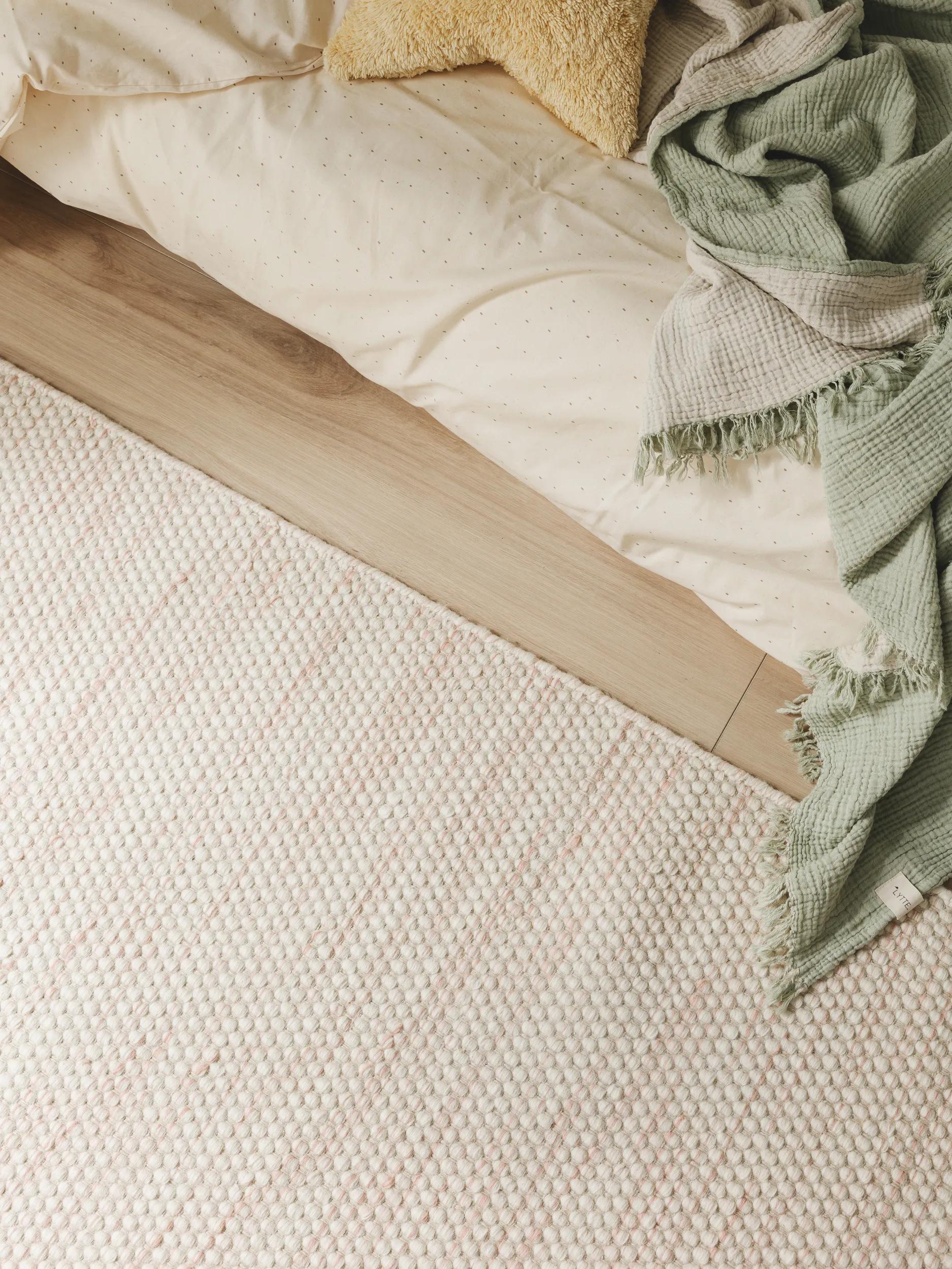 Chaque détail participe à l’ambiance : le tissage en motif tressé crée une surface texturée qui invite au toucher, stimule l’imagination et résiste à l’usure des jeux quotidiens. Les fonds de coussin, les cubes empilés et les longues histoires du soir trouvent leur écrin sur une base stable qui amortit sans s’affaisser, pour des heures de construction, d’apprentissage et de calme.