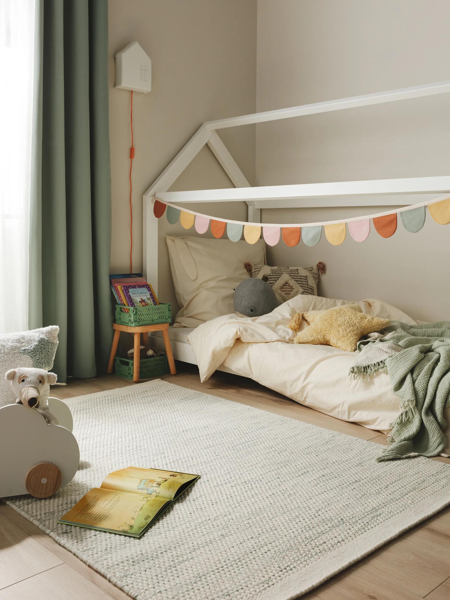 Dans la lumière douce du soir, imaginez un coin qui respire la tranquillité et la poésie nordique : un sol habillé d’un design scandinave qui invite aux histoires murmurées et aux couchers complices. La palette en crème et gris appelle la sérénité, se marie aux rideaux légers et au mobilier en bois pour créer un véritable cocon où chaque objet raconte le calme d’une chambre pensée pour grandir.