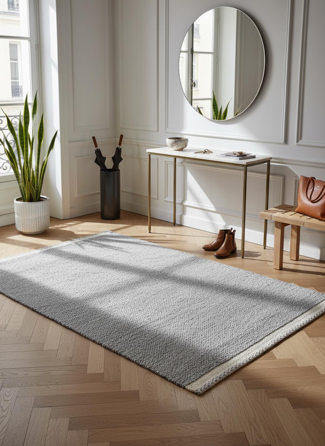 La lumière douce d'un intérieur nordique se reflète naturellement sur un tapis au dessin épuré, où l'esprit scandinave se lit dans la simplicité des formes et la clarté des teintes, offrant une surface qui respire et apaise sans jamais surcharger l'espace.