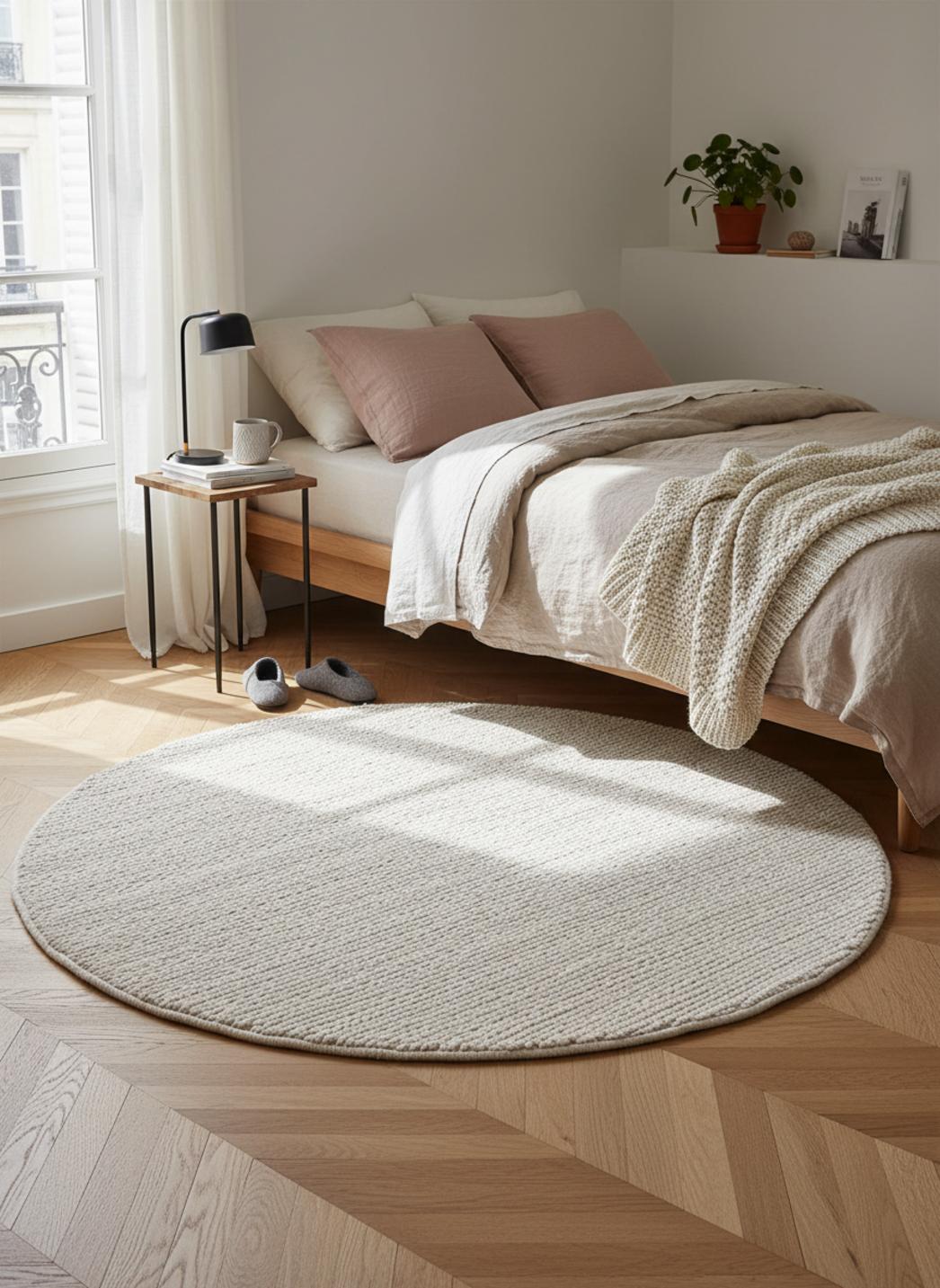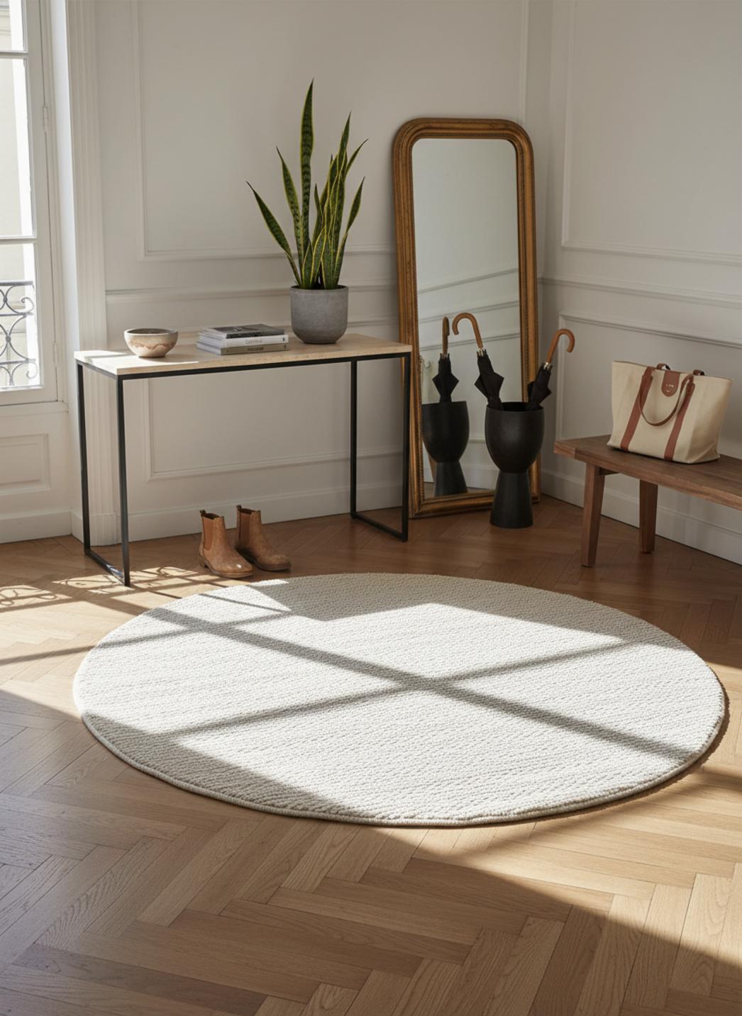 Dans un salon baigné de clarté, la forme rond crée un point d'harmonie, un cocon qui recentre le regard et invite au calme. La dimension de 100 cm de diamètre définit une zone d'accueil sous une petite table basse ou près d'une méridienne, offrant une présence discrète mais suffisante pour structurer l'espace. L'effet circulaire adoucit les lignes du mobilier et instaure une circulation fluide autour des pièces centrales.