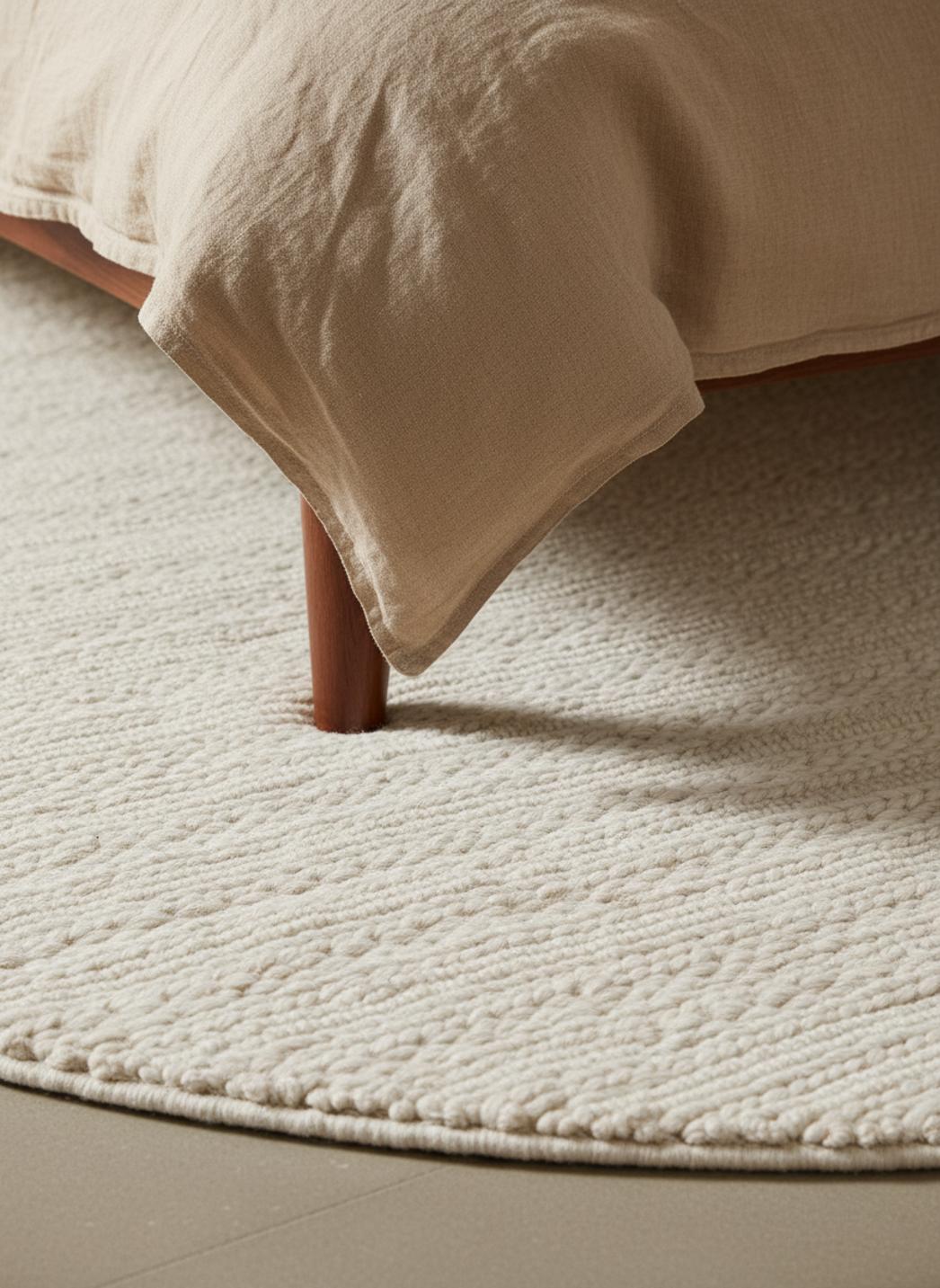 La matière, pensée en laine, évoque une chaleur naturelle et une densité douce au toucher, idéale pour réchauffer un parquet en bois clair ou se fondre dans un coin lecture. La surface tressée conserve une allure artisanale tout en restant contemporaine, apportant une profondeur subtile au sol sans alourdir la composition. Les finitions soignées soulignent un rendu premium, discret et très accueillant.