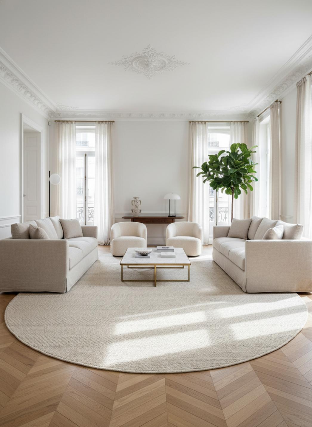 La texture invite à la lenteur, douce au contact et légère sous les pas. Le choix d'une teinte crème renvoie la clarté et agrandit l'espace, tandis que la couture circulaire souligne la forme rond avec simplicité. Les volumes restent aérés, les contrastes fins, et chaque détail participe à une atmosphère minimaliste et enveloppante, fidèle à l'esprit du design nordique.