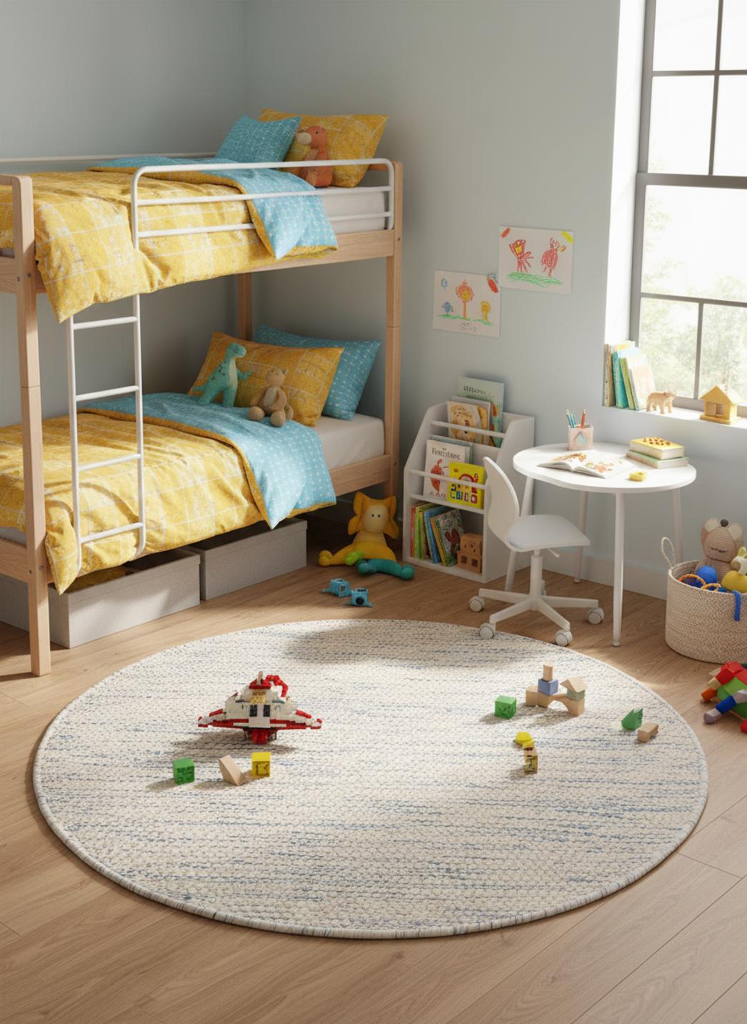 Considérez la décoration comme une caresse : les notes de blanc et de bleu dialoguent avec des meubles clairs et des lumières tamisées pour composer un tableau serein, propice aux jeux calmes et aux lectures partagées. Le tapis devient point d’ancrage, invitant à déposer un coussin pour un coin lecture ou à dessiner des sentiers imaginaires pour des aventures intimes.