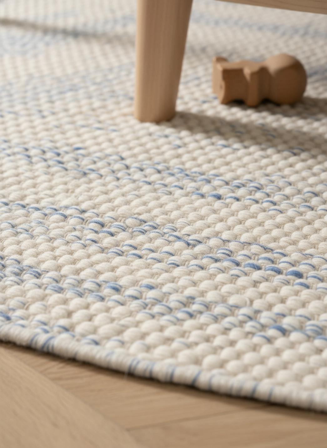 Tapis scandinave tressé rond enfant blanc et bleu en laine 150 cm de diamètre