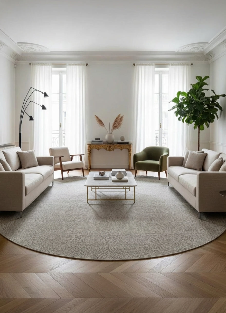 Le diamètre généreux de 250 cm offre une réelle présence sans alourdir la pièce, définissant une zone conviviale où les meubles respirent et où la circulation reste fluide. Sa forme et son volume permettent de recentrer un salon ou d’accompagner une grande chambre en lui apportant chaleur et structure.