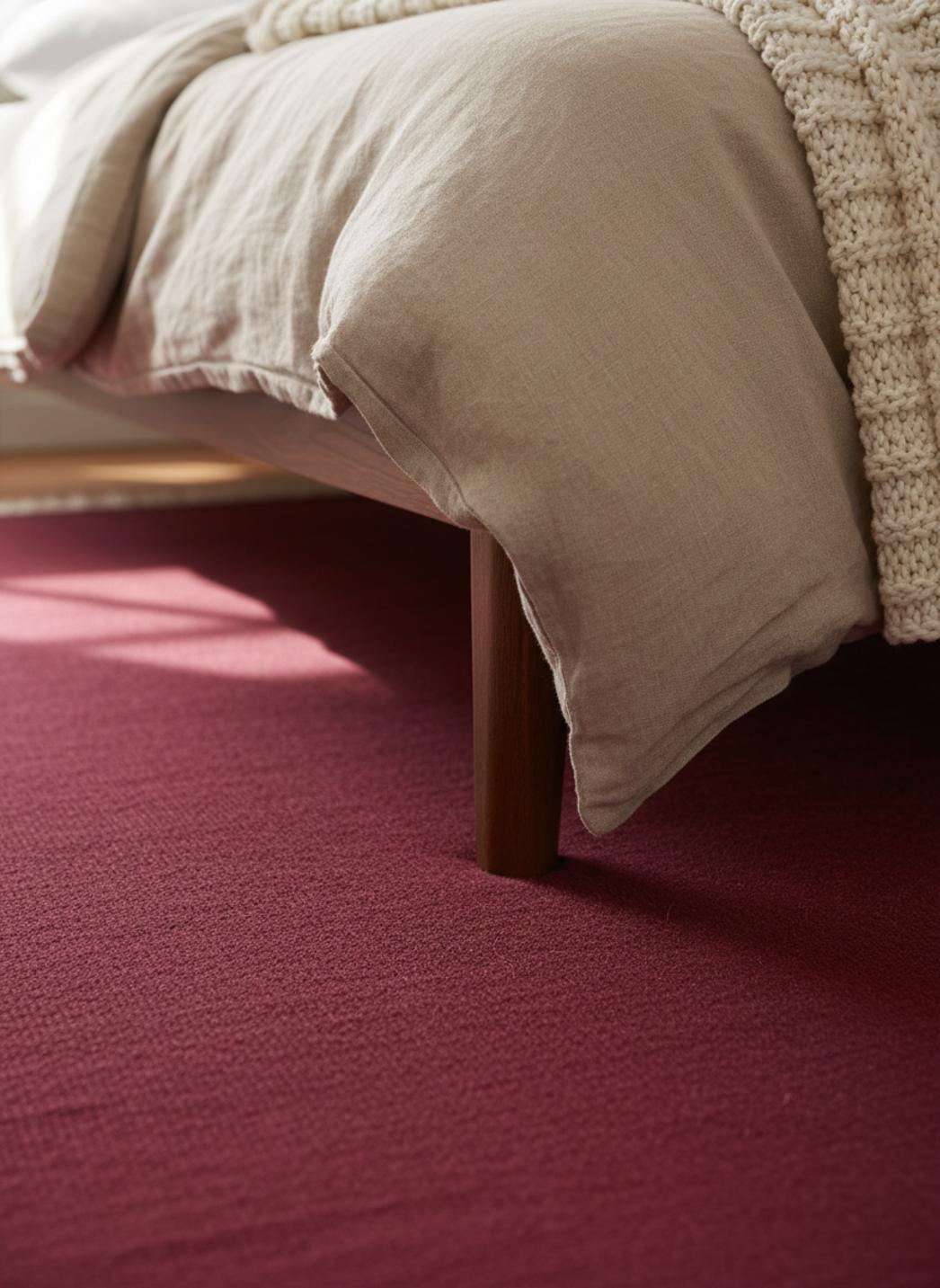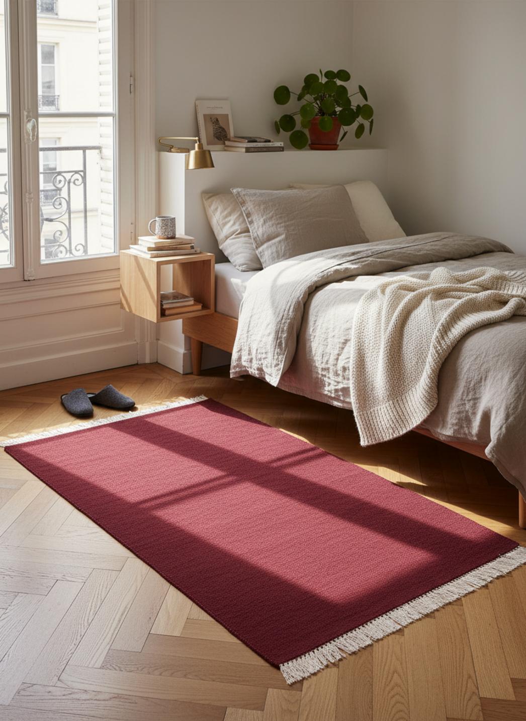Dans une pièce baignée de lumière nordique, ce tapis révèle une douceur profonde qui invite à la détente, fidèle à l'esprit scandinave. Sa teinte bordeaux apporte une touche chaleureuse sans alourdir l'ensemble, se mariant avec des murs clairs et des essences de bois pâle. L'absence de motifs complexes souligne une esthétique épurée, laissant le regard se poser sur la texture et le mouvement discret des fibres.