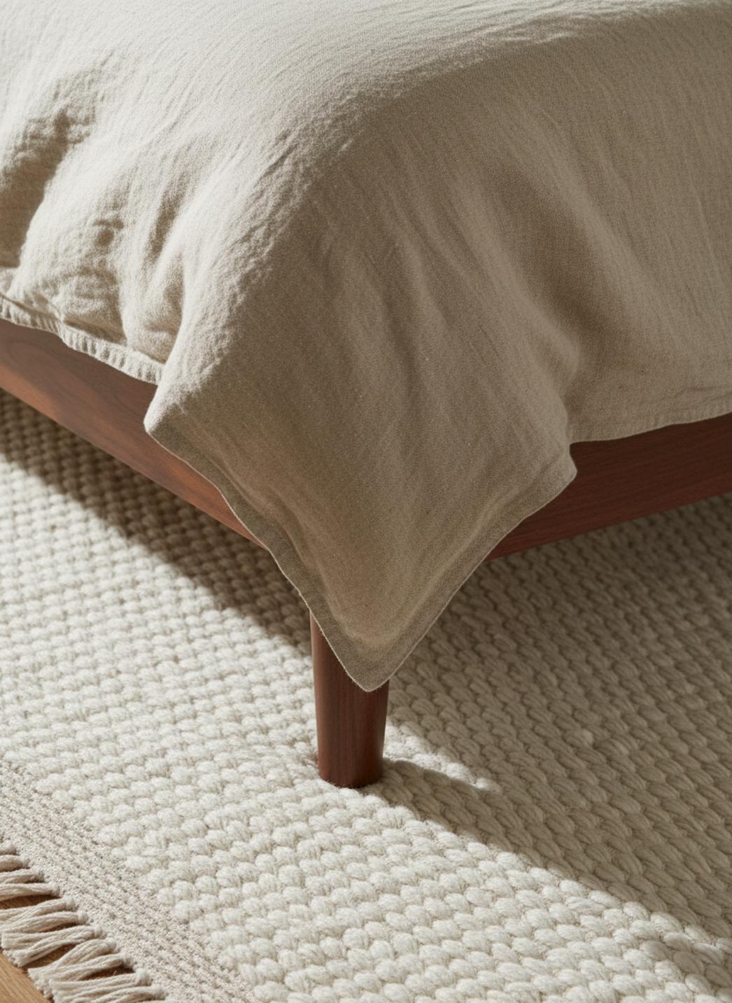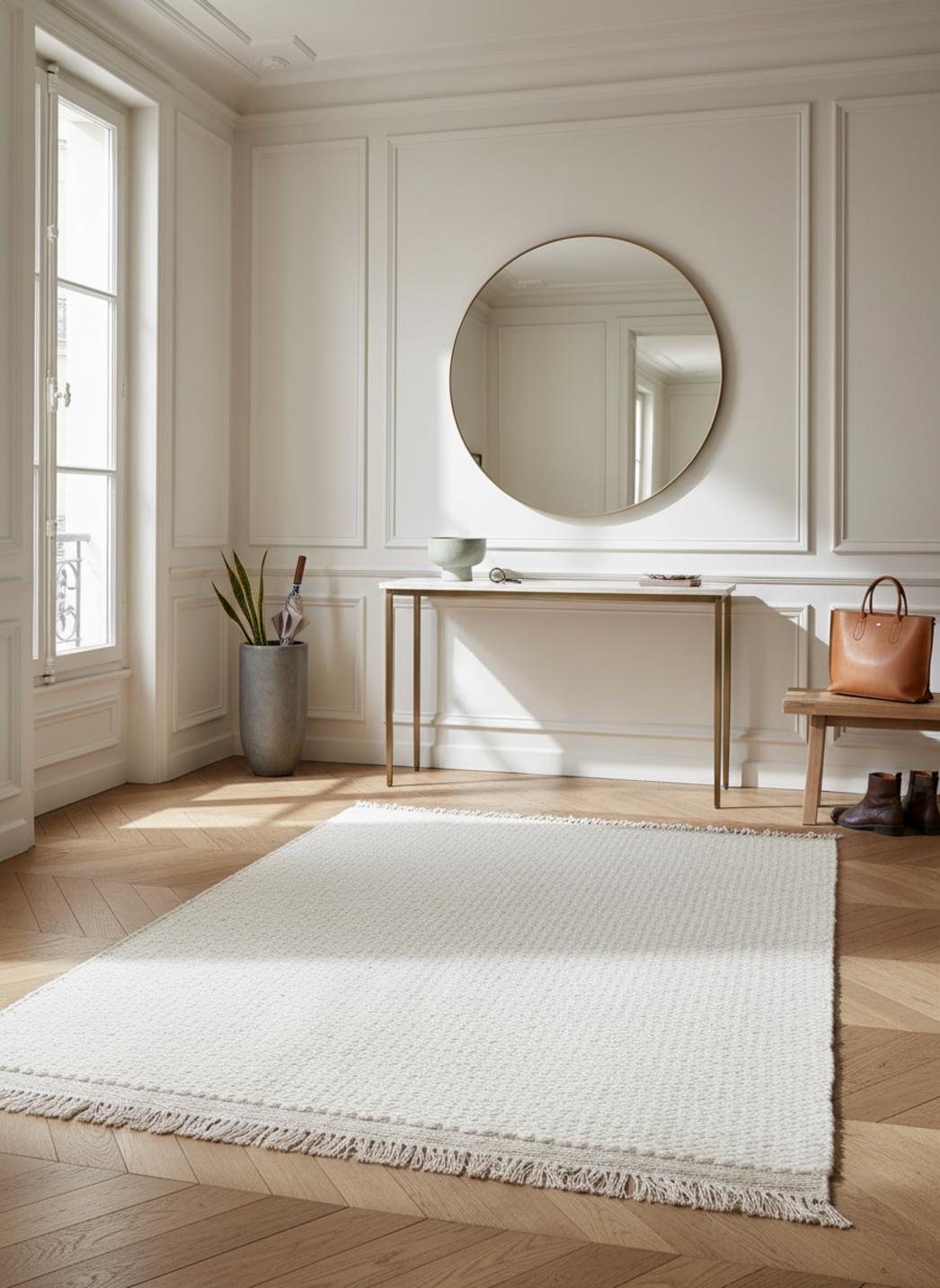 Il modernise un salon en apportant une chaleur discrète, il adoucit une chambre lumineuse et il rend un couloir plus accueillant en soulignant la perspective. La présence mesurée de franges et le rendu uni permettent des accords faciles avec des accessoires en ocre pâle, gris clair ou bleu doux pour prolonger la palette nordique. L’entretien se veut simple et adapté à un quotidien serein.