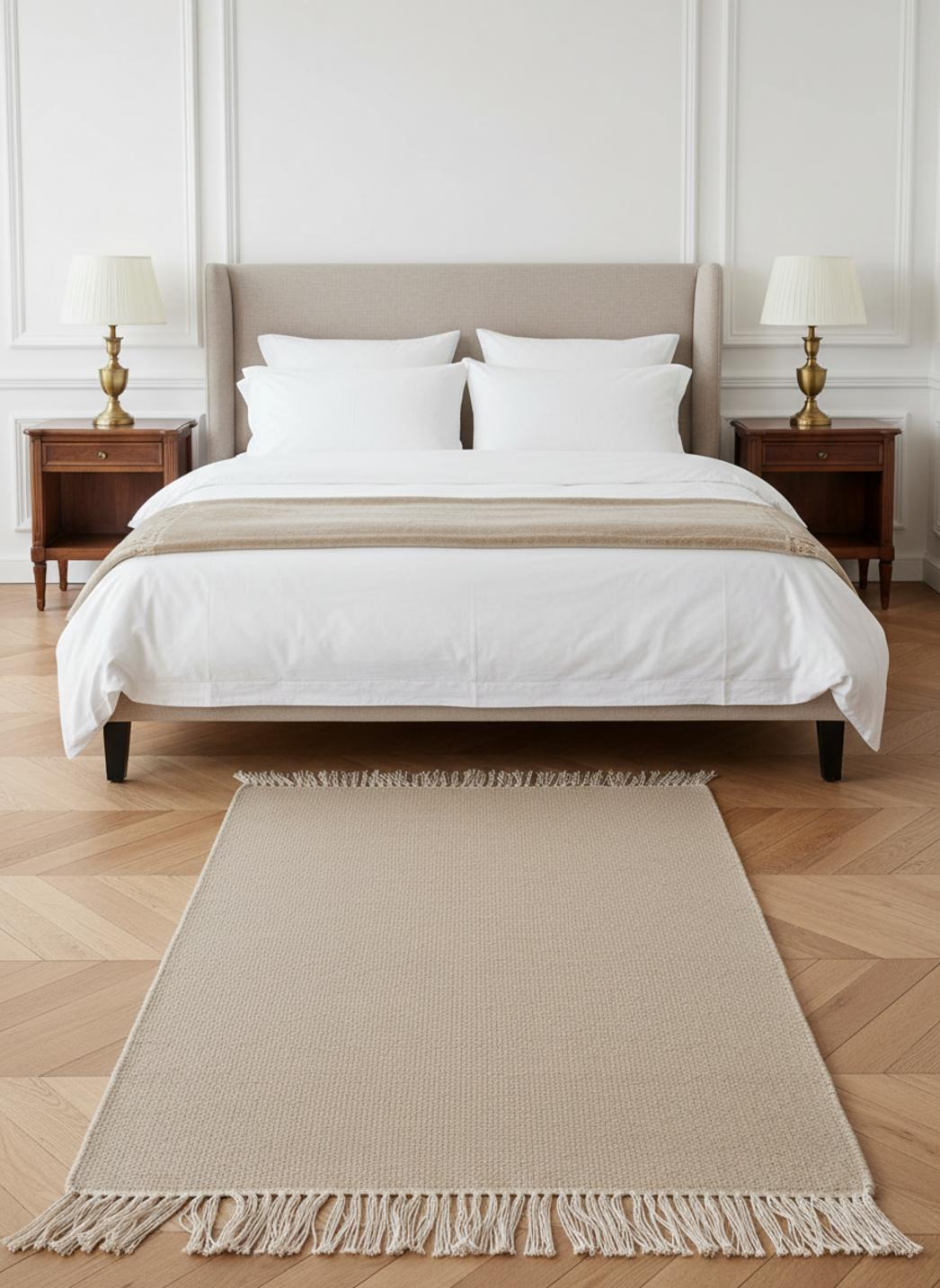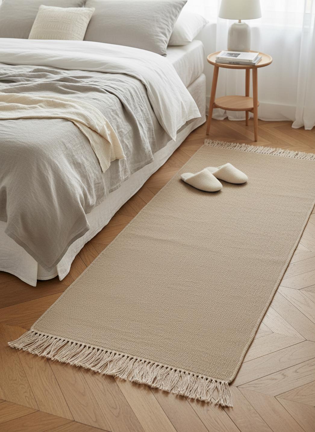 Tapis scandinave uni à franges descente de lit beige en laine 70x200 cm
