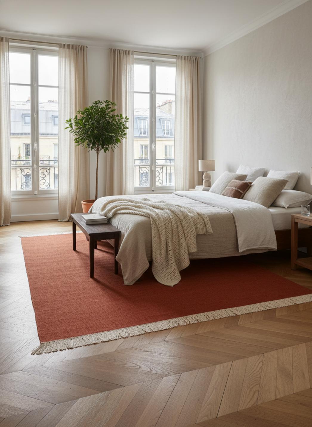 Ce choix chromatique inspiré du rouge terre s'inscrit dans une palette sereine, la nuance brique se mêlant aux beiges et aux gris clairs pour composer une atmosphère à la fois moderne et apaisée, parfaite pour recentrer une zone de vie.