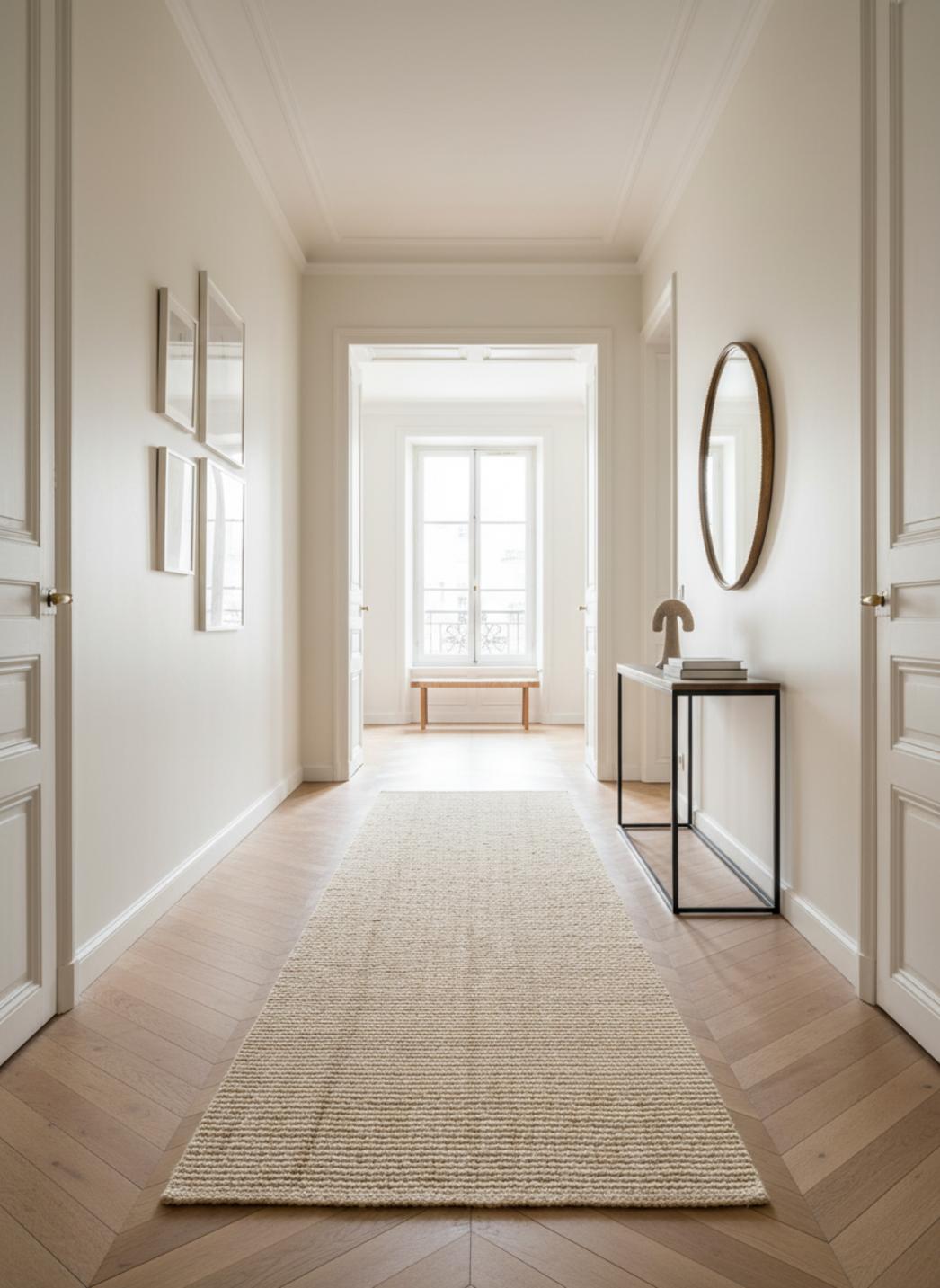 Le format allongé révèle le caractère d’un couloir repensé, où la perspective est adoucie et le passage devient un élément décoratif. La pose recentre l’espace et crée une continuité visuelle entre les pièces, sans surcharger. Les lignes claires et le faible contraste renforcent l’impression d’un volume apaisé et ordonné.