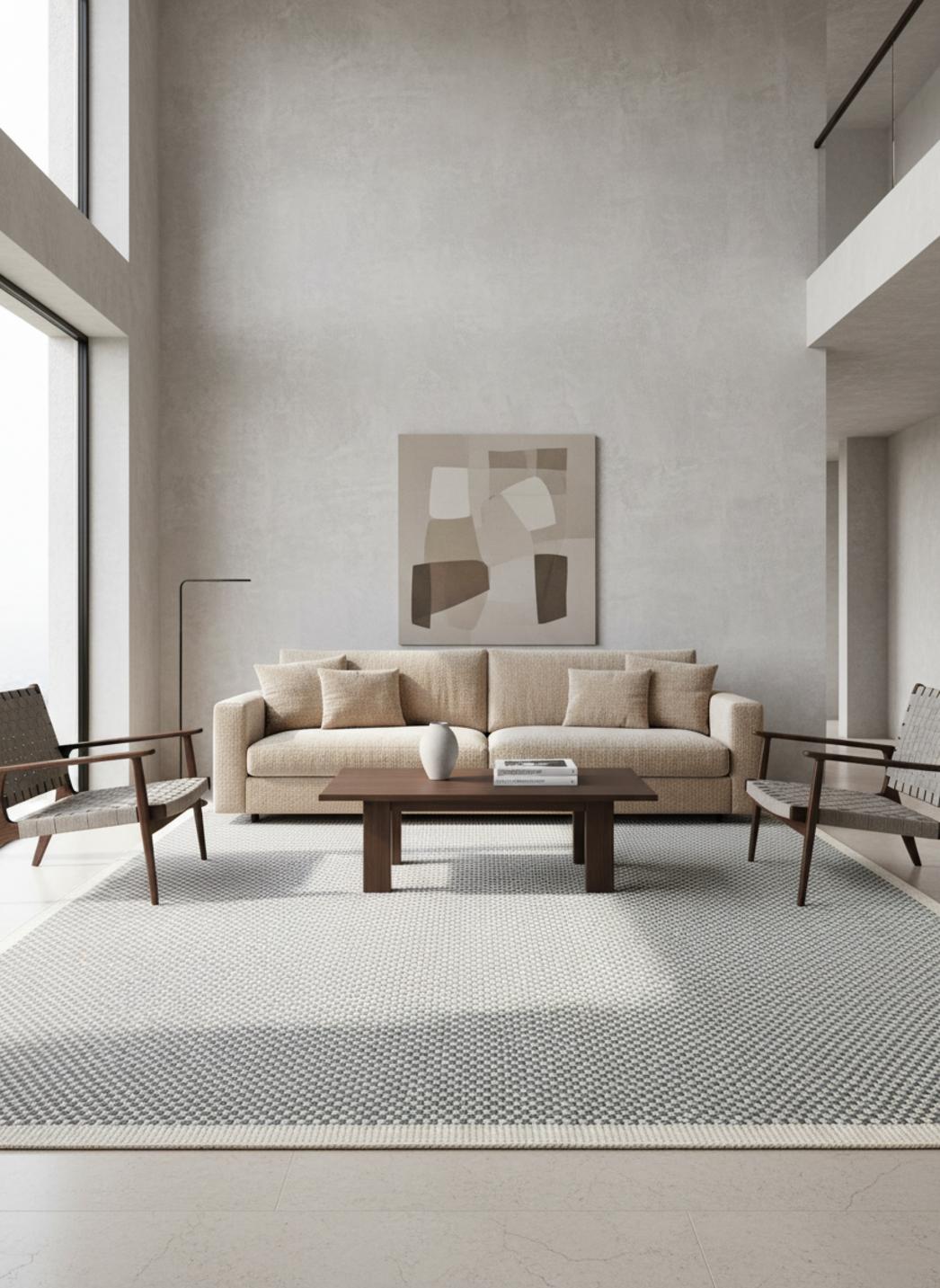 Pensé pour accompagner un salon au bois clair ou une chambre aux textiles lin, ce tapis crée un point d’équilibre qui recentre un canapé léger ou un lit flottant, tout en respectant la géométrie simple d’un intérieur contemporain.