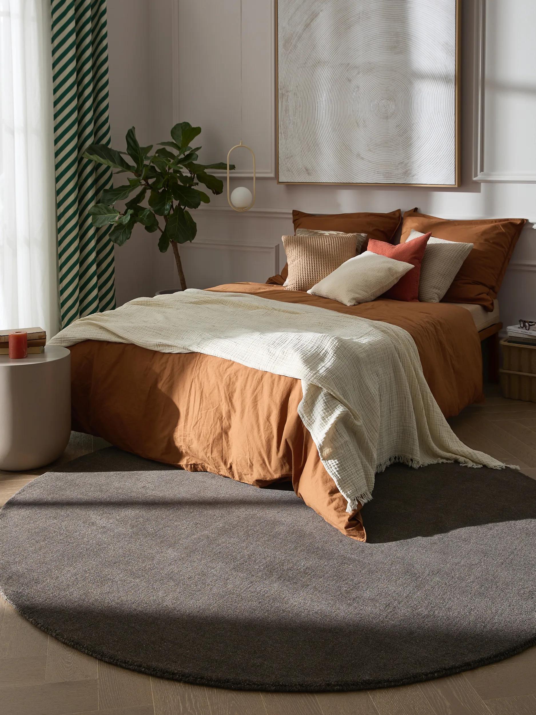 Posé sur un parquet clair ou à côté d’un fauteuil en rotin, le tapis uni joue la carte de la simplicité raffinée. Les contours épurés soulignent le mobilier sans concurrence, offrant un équilibre entre fonctionnalité et esthétique, et laissant la lumière traverser la pièce pour une ambiance sereine et lumineuse.