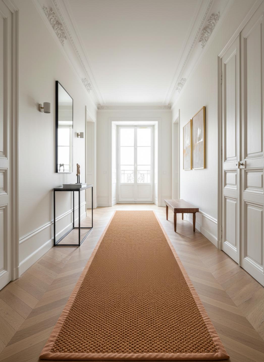 Le format conçu pour un couloir mesure 70x240 cm et définit une trajectoire apaisée, recentre le pas et adoucit les allées entre les pièces, créant un fil conducteur discret dans un intérieur aux matériaux clairs.