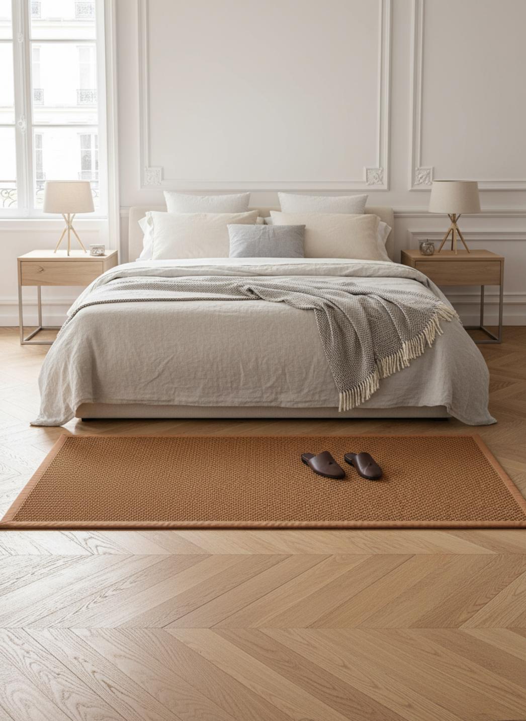 Dans une ambiance où la lumière naturelle est reine, ce tapis incarne l'esthétique scandinave par sa simplicité et ses lignes sereines, une présence discrète qui laisse respirer l'espace tout en apportant une note d'intimité chaleureuse.