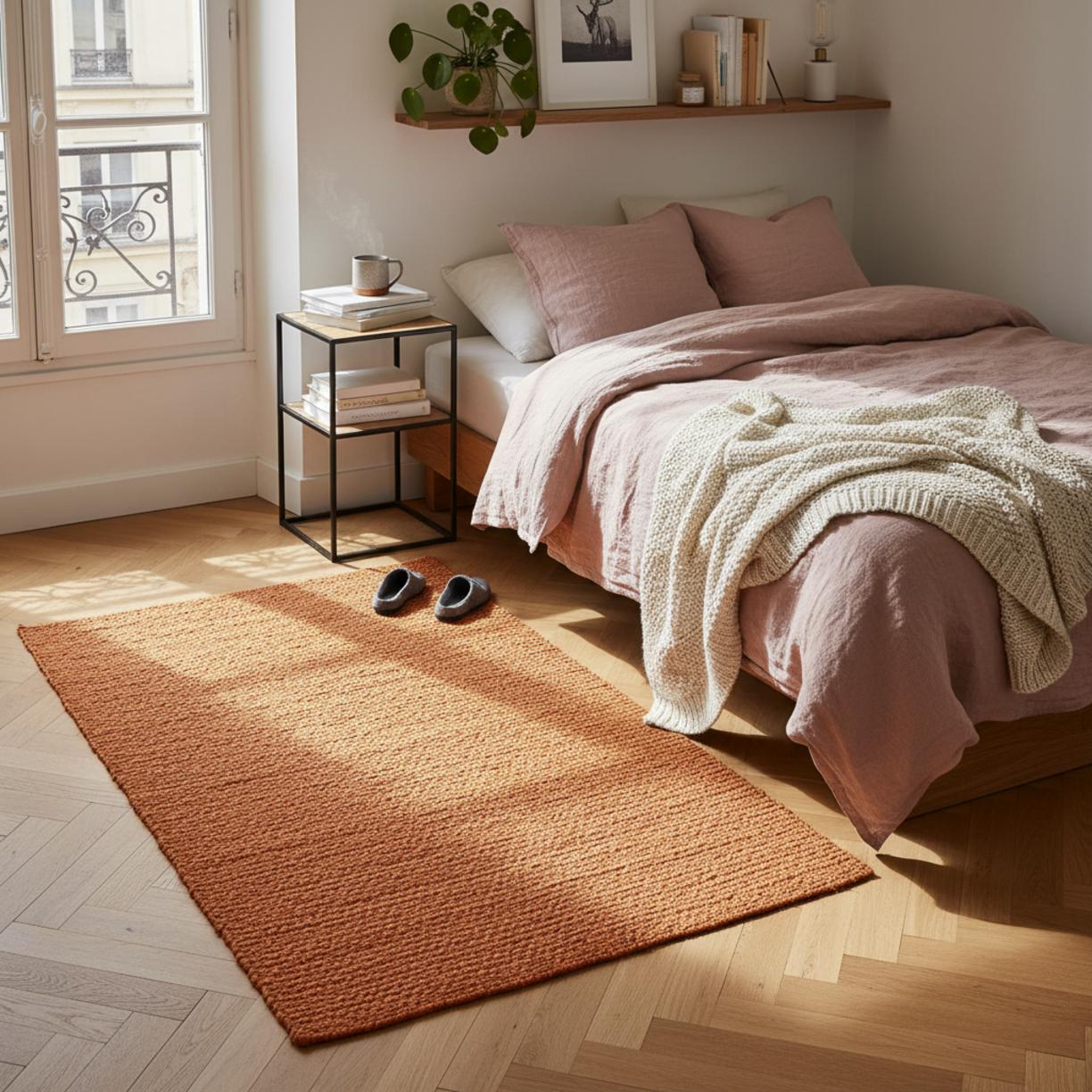 La lumière naturelle trouve un compagnon discret dans ce tapis, où l'esprit scandinave se traduit par une écriture simple, des lignes calmes et une couleur orange douce qui réchauffe sans fatiguer le regard.