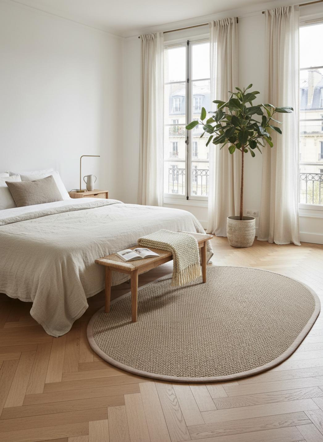 Sous une lumière douce, l'ambiance évoque la délicatesse du style scandinave, où la simplicité devient décor. La texture tressée, pensée en aplats réguliers, offre une présence discrète et chaleureuse qui laisse respirer l'espace. Les lignes restent épurées et l'ensemble se montre lumineux, emplissant la pièce d'une sensation apaisée et volontairement minimale.