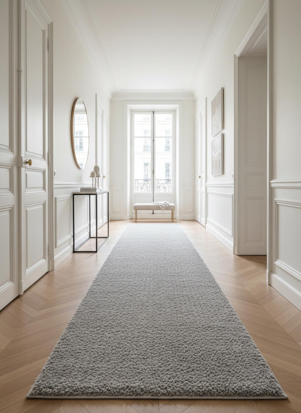 La silhouette longiligne redéfinit le couloir en y insufflant une sensation hygge, invitant à la pause et à la lenteur. Posé devant une porte ou le long d’un mur, ce tapis modifie instantanément la perception de l’espace, transformant un trajet quotidien en scène accueillante et feutrée, propice aux pas silencieux et aux retrouvailles chaleureuses.