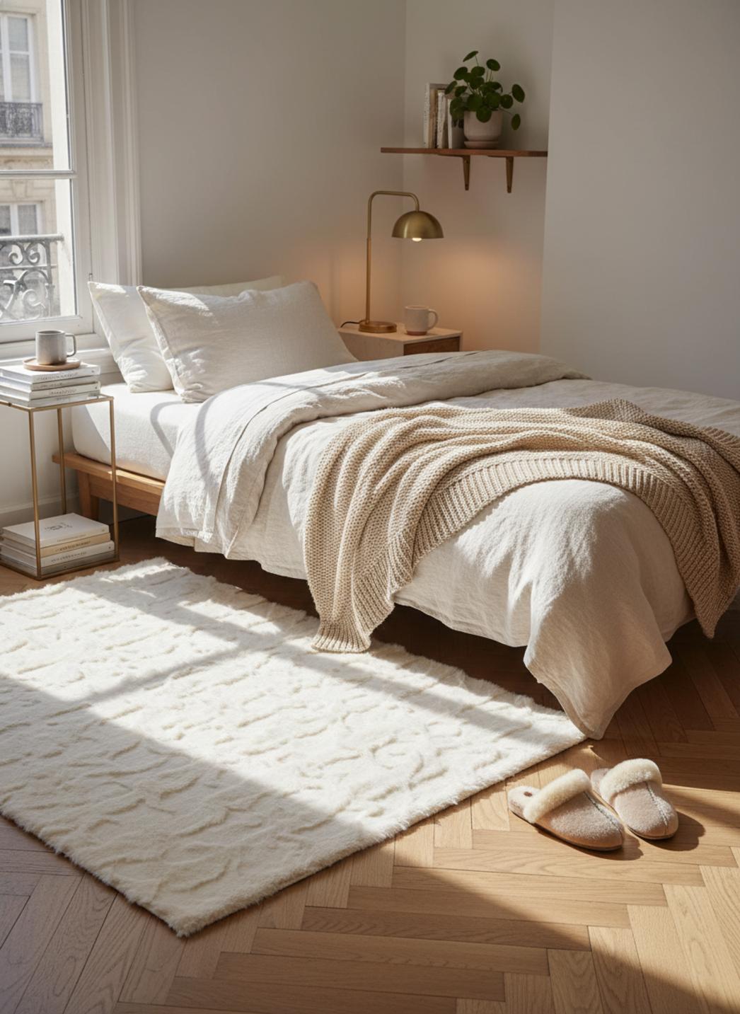 Son design étudié et ses dimensions de 60x120 cm trouvent naturellement leur place près d’un lit, sous une console d’entrée ou comme tapis de confort devant un fauteuil, contribuant à créer un petit ilot cosy dans des espaces variés. La nuance de blanc cassé adoucit la lumière et réchauffe l’ensemble sans imposer de contraste abrupt, favorisant une ambiance hygge et apaisée.
