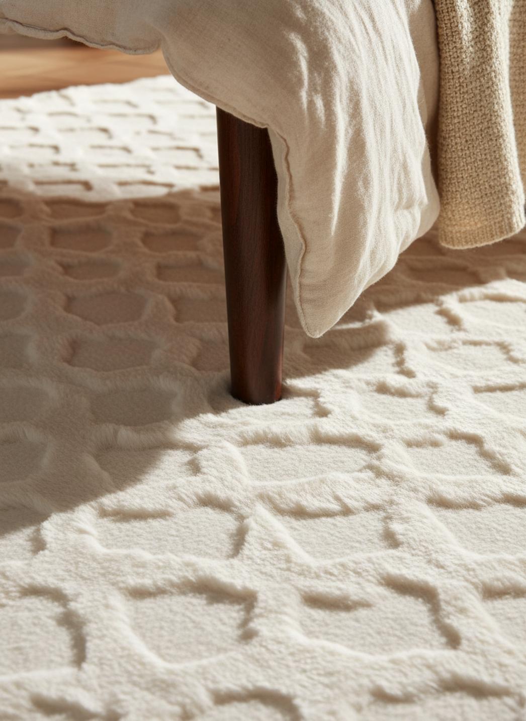 La sensation est moelleuse sans lourdeur, un confort qui isotrope la pièce et absorbe les bruits du quotidien, rendant les conversations plus feutrées et les pas plus silencieux. L’épaisseur généreuse déploie un effet enveloppant et une chaleur immédiate sous la plante du pied, parfaite pour transformer un coin lecture en refuge ou adoucir l’accès à une chambre.