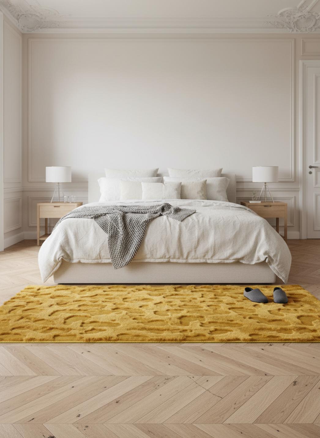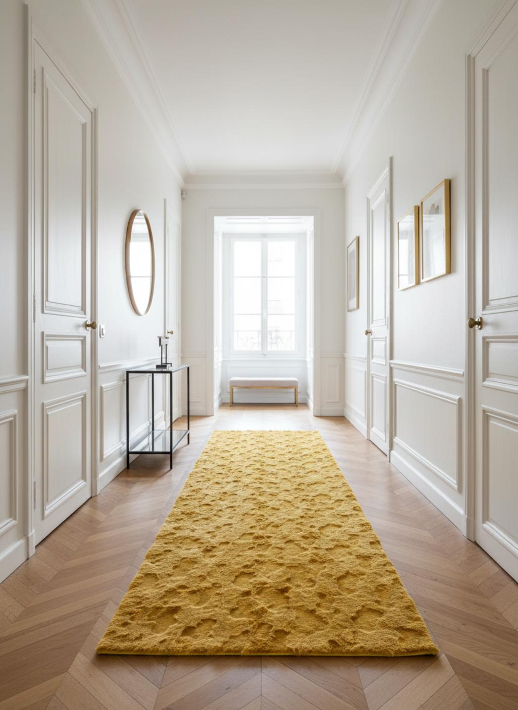 Dans une chambre, un salon ou un coin lecture, cette pièce s’impose comme un élément de décoration cosy et hygge: le jaune tempère l’atmosphère avec une lumière douce, tandis que la silhouette allongée de 60x200 cm crée un point d’équilibre minimaliste qui accompagne les meubles et les gestes du quotidien.