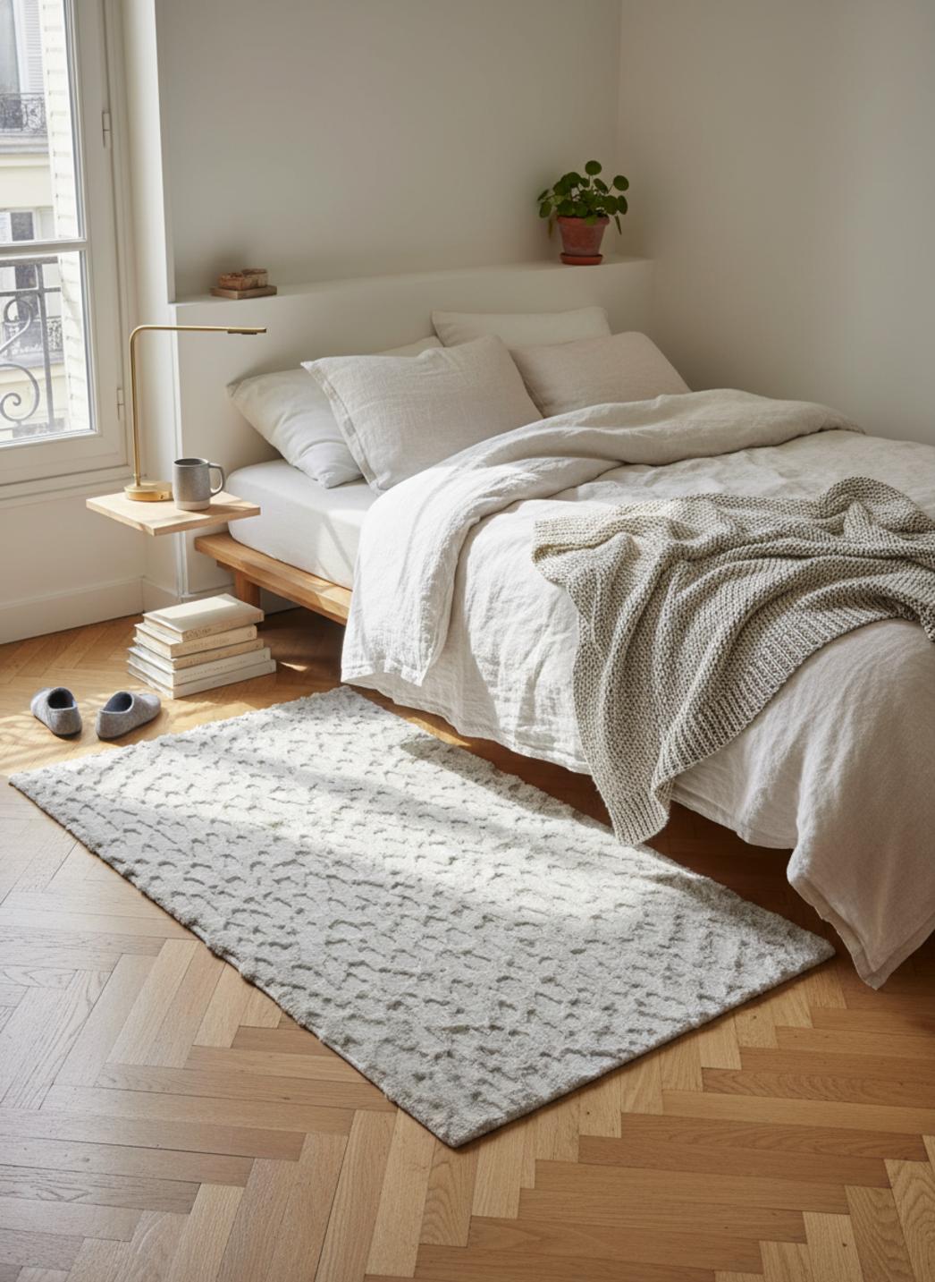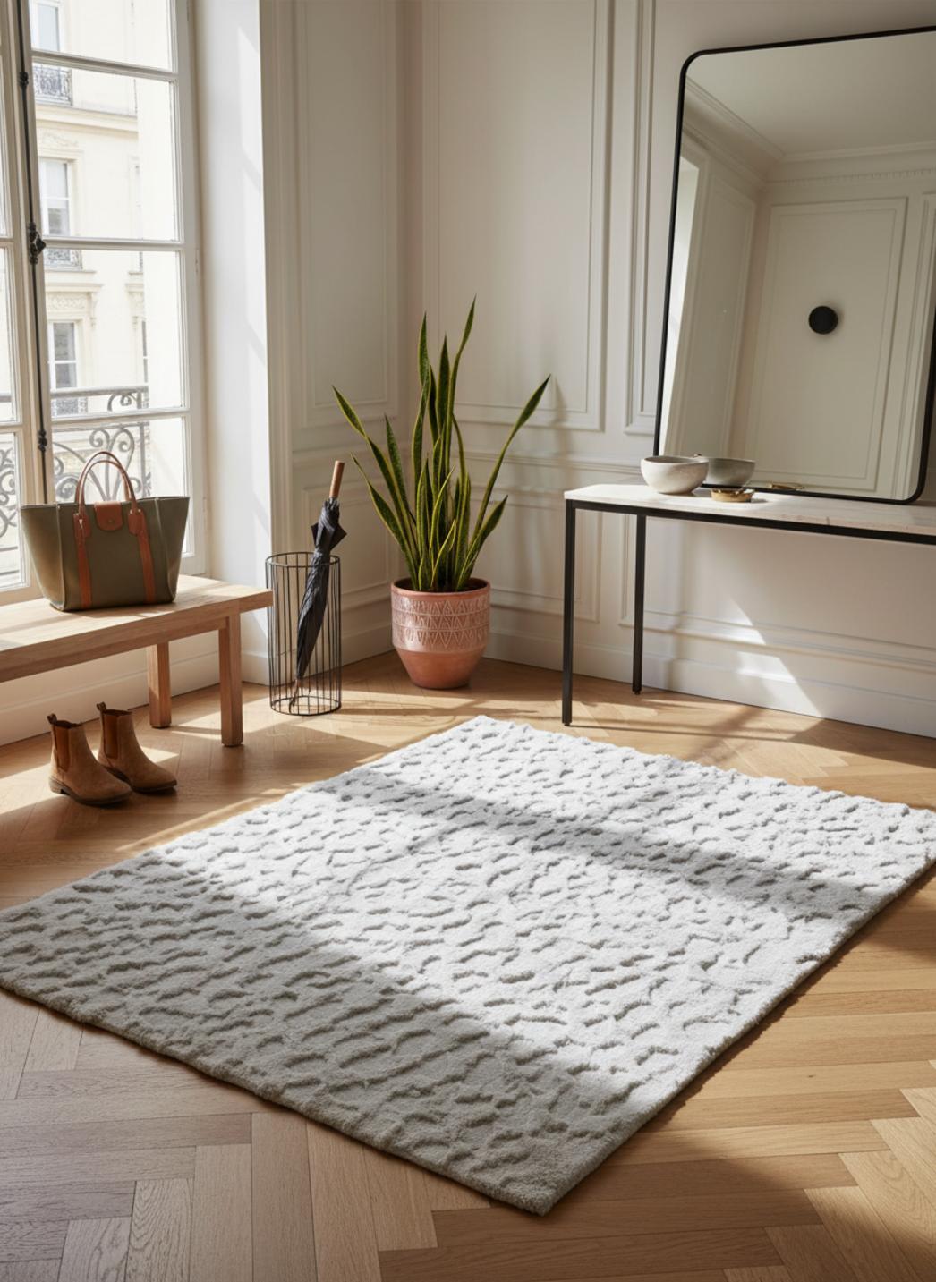 Il transforme un sol froid en surface accueillante et légitime le geste de marcher pieds nus ; le relief texturé structure la lumière et crée des nuances, donnant à la pièce un équilibre visuel raffiné sans excès, parfaitement adapté aux proportions d’un petit salon ou d’un couloir ponctuel.