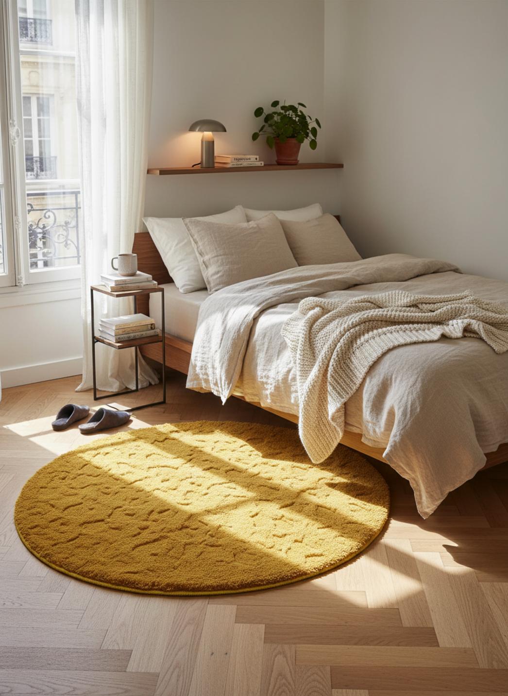 La lumière se pose différemment sur ce tapis, modulant l’ambiance du salon, réchauffant la chambre ou définissant un coin lecture. Dans un couloir discret ou sous une table basse, ce tapis transforme l’espace, instillant une signature hygge : confort sous les pieds, chaleur perceptible, et une esthétique qui invite à la pause. La couleur jaune réveille les tons neutres et compose un camaïeu apaisant avec des matières naturelles.
