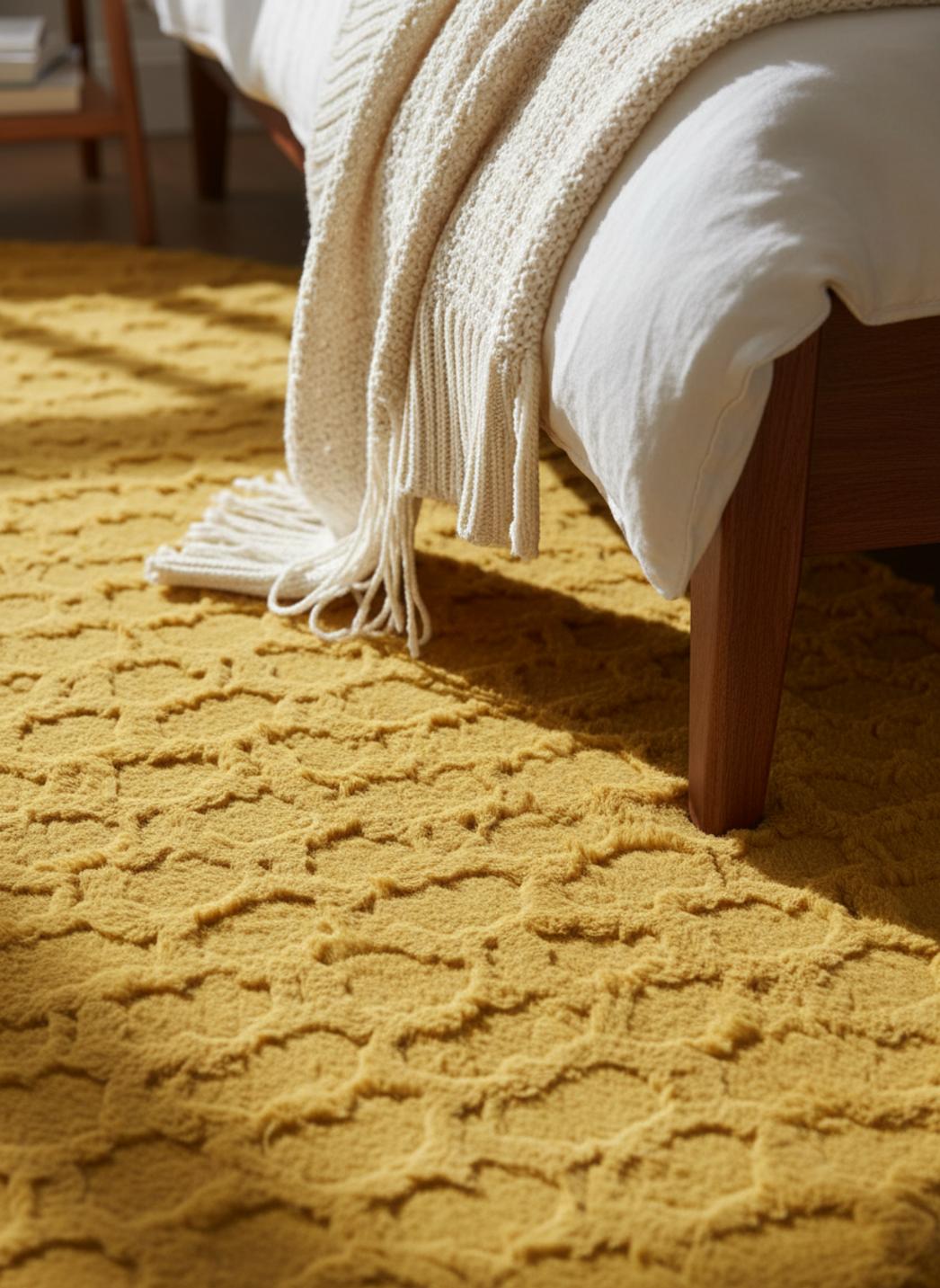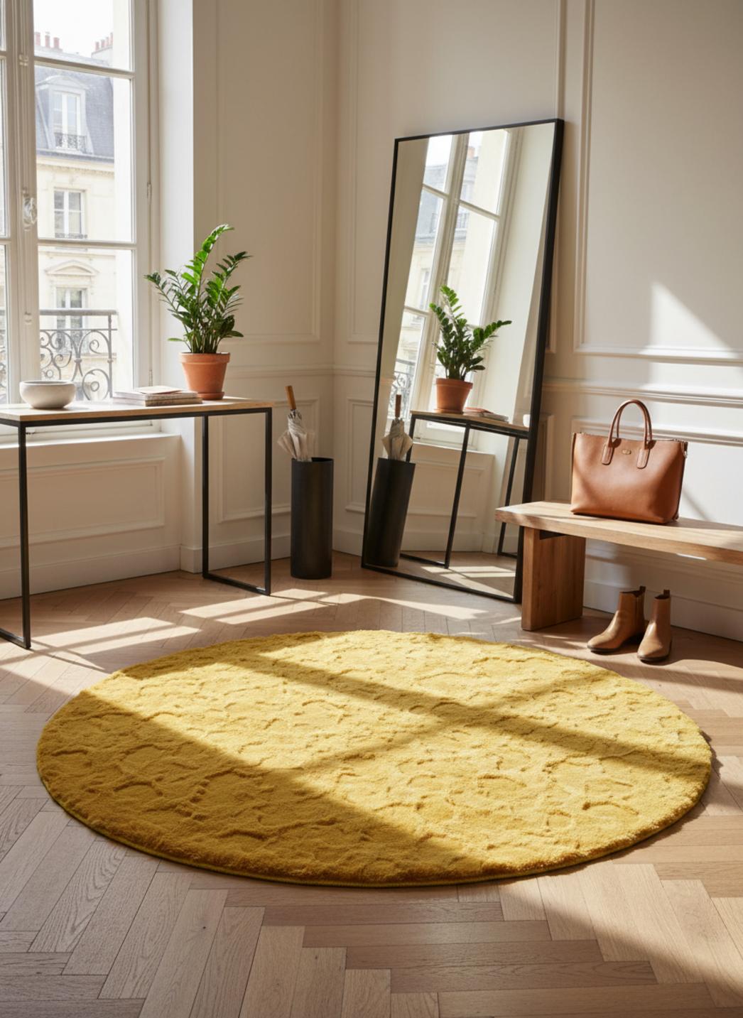 Imaginez la caresse des poils longs sous la plante du pied : la surface devient une invitation au ralentissement, où chaque pas se love dans une douceur profonde. Le choix d’un shaggy au rendu texturé et d’une teinte jaune apporte une présence chaleureuse, une vibration lumineuse qui reste délicate et raffinée plutôt qu’exubérante.