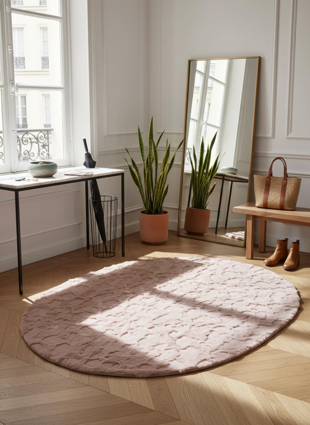 Dans un salon, une chambre ou un coin lecture, la teinte subtile du rose poudré apporte une chaleur feutrée et un soupçon romantique sans imposer, capable de dialoguer avec une palette minimaliste comme avec des matériaux bruts. Le tapis texturé devient alors un élément décoratif à part entière, capable de réchauffer un parquet, d’adoucir un couloir ou de structurer un coin détente.
