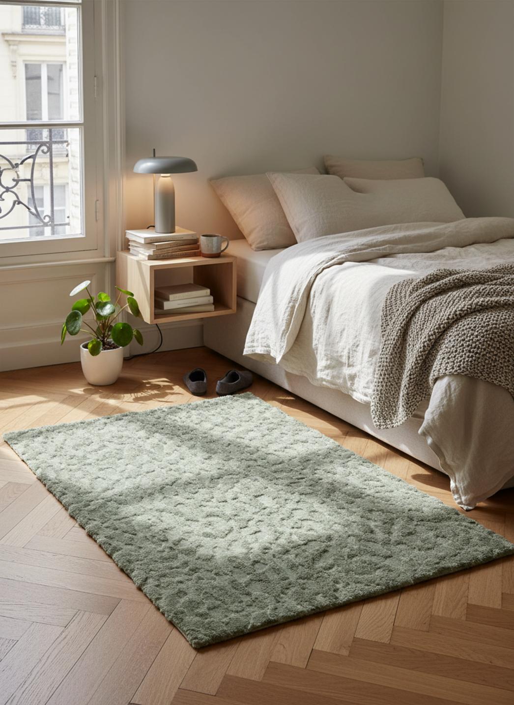 Dans un coin lecture, au pied du lit ou devant une cheminée, il propose une présence discrète mais définie qui invite à la lenteur. Sa teinte vert sauge s’accommode d’une décoration scandinave ou d’un intérieur plus contemporain, apportant une touche organique sans jouer les contrastes trop vifs. Posé avec soin, il devient le fil conducteur d’une atmosphère chaleureuse et feutrée.
