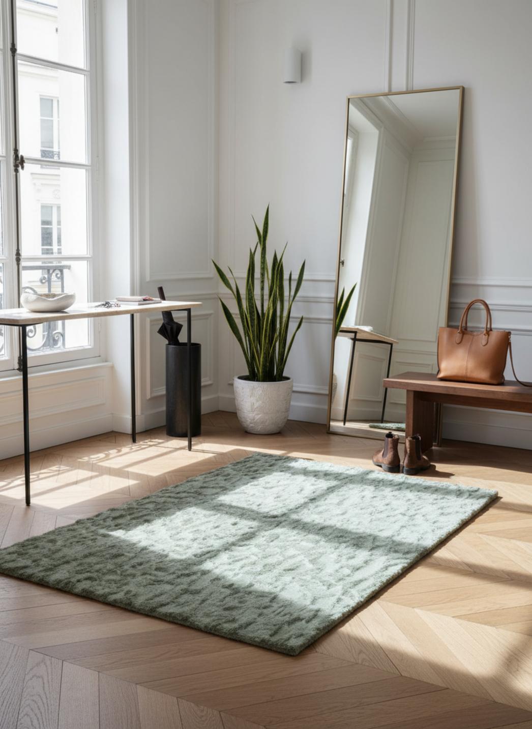 Sous la caresse des doigts, le shaggy révèle une matière généreuse où les poils longs dessinent une surface riche et accueillante, comme une prairie domestiquée. La coupe texturé joue avec la lumière et la densité pour offrir une douceur profonde : chaque pas y glisse et s’enfonce légèrement, procurant un effet enveloppant qui réchauffe immédiatement l’atmosphère. Le choix d’un vert sauge s’épanouit sans ostentation, laissant une présence visuelle apaisante et subtile.