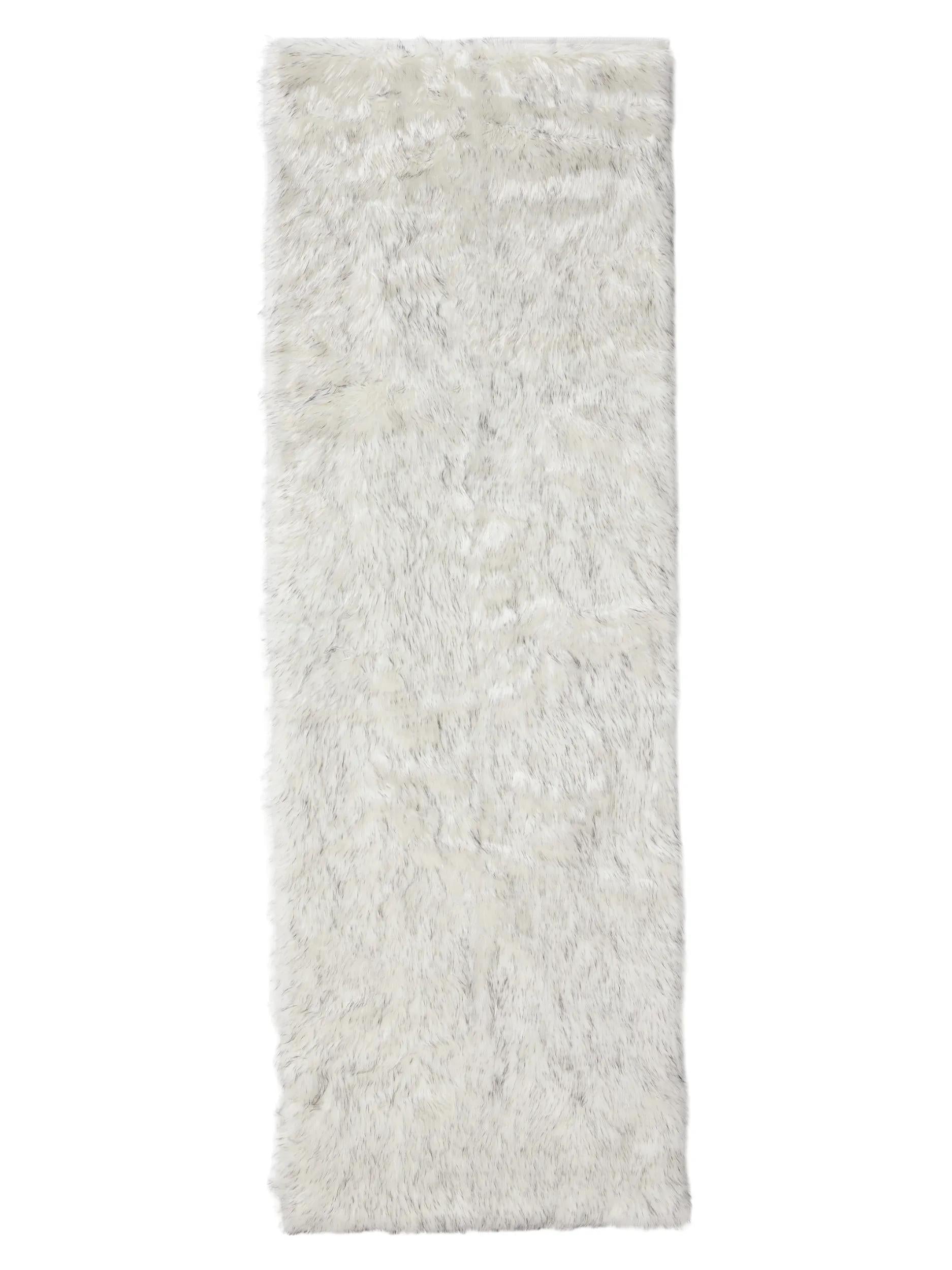 Au toucher, la densité des fibres révèle une douceur profonde : les poils longs glissent sous la paume et offrent cet effet de fourrure qui invite à poser les pieds. Le contraste entre noir et blanc structure une présence visuelle sophistiquée, tandis que le volume généreux crée un voile moelleux, presque chaleureux, qui enveloppe chaque pas.