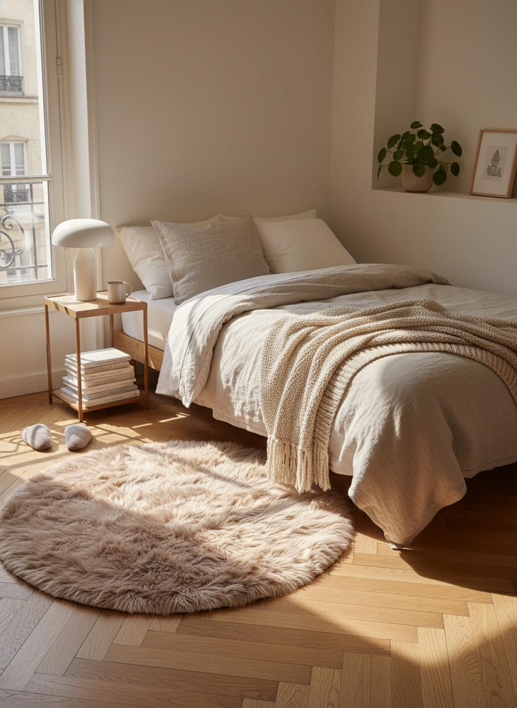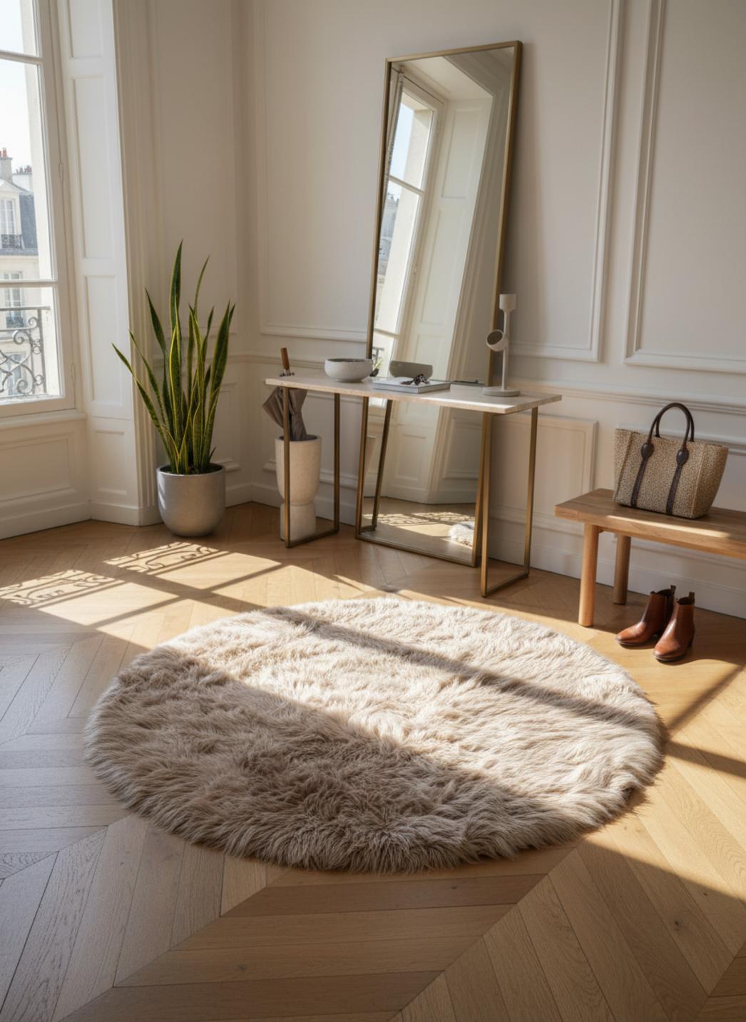 Dans l’espace visuel, la présence de ce tapis rond joue la carte de la douceur visuelle : sa forme circulaire accentue l’effet cocon et rééquilibre les lignes du mobilier, tandis que la teinte beige diffuse une lumière douce et naturelle. L’absorption sonore devient perceptible : pas de résonances vives, seulement une atmosphère plus feutrée, propice à la lecture, à la conversation ou à la sieste improvisée.