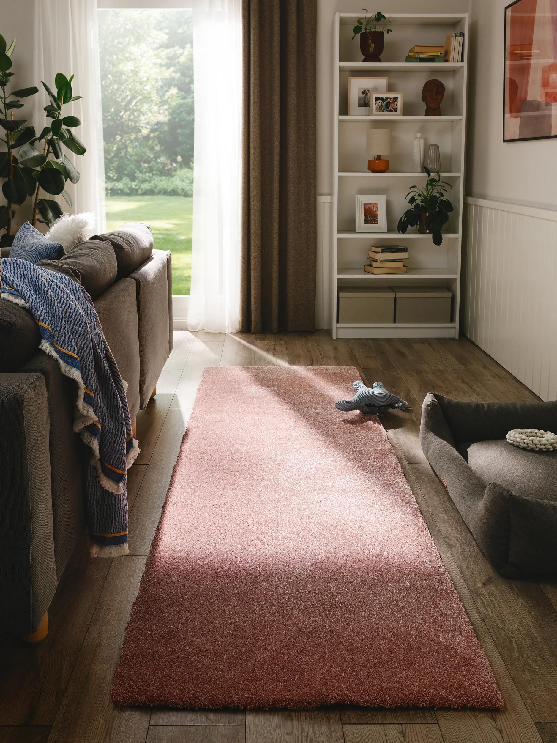 Sous les pieds, la caresse des poils longs évoque une douceur profonde et une sensation moelleuse qui invite à la pause. Ce tapis shaggy affiche une fibre dense et généreuse, un volume qui crée un effet enveloppant et procure une chaleur immédiate à chaque pas. La présence visuelle est aussi rassurante qu’un plaid au coin du feu : la couleur rose diffuse une lumière douce, tandis que la profondeur de la matière capte la lumière et atténue les reflets pour une allure cocooning très contemporaine.