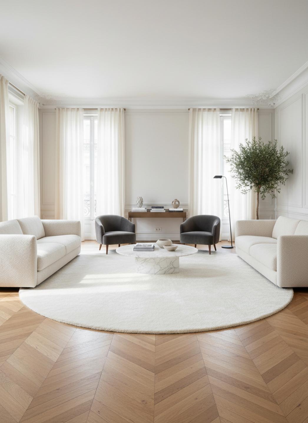 Sous la lumière naturelle, la silhouette rond affirme une douceur visuelle qui invite à la contemplation et au lâcher-prise. La coupe circulaire concentre l’attention, comme un cocon posé au centre d’un salon ou au pied d’un fauteuil de lecture, tandis que le grand diamètre de 200 cm permet de structurer l’espace sans l’alourdir. L’éclat du ton blanc réchauffe l’ensemble grâce à sa présence lumineuse, simple et apaisante, idéale pour une décoration contemporaine ou un intérieur d’esprit hygge.
