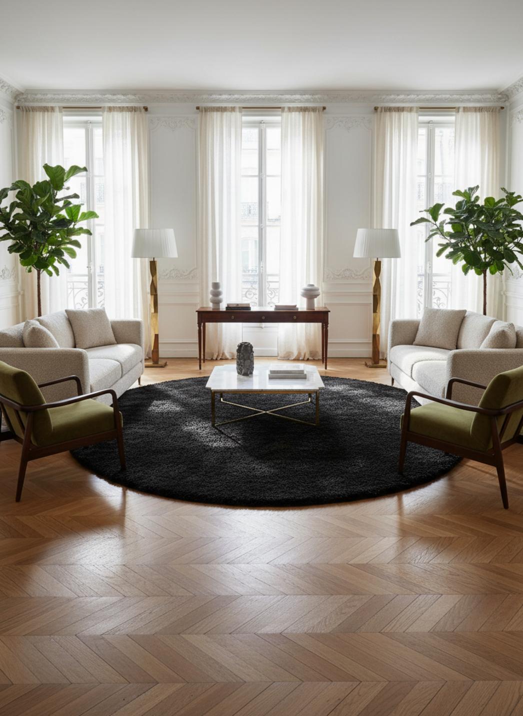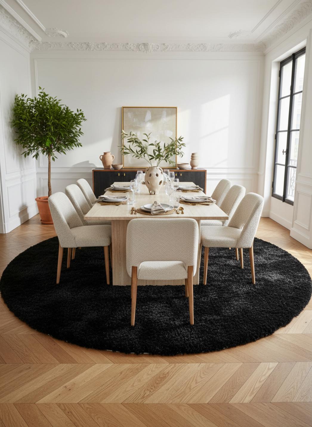 La coupe et la structure de la pièce, associées à la rondeur du format, créent une invitation au cocon : autour de ce cercle, on ralentit le geste, on s’assoit, on lit, on se laisse envelopper. Le format rond accentue la douceur visuelle et transforme un coin lecture ou un centre de salon en refuge tactile, tandis que le volume généreux du tapis soudent l’espace et affinent l’équilibre décoratif.