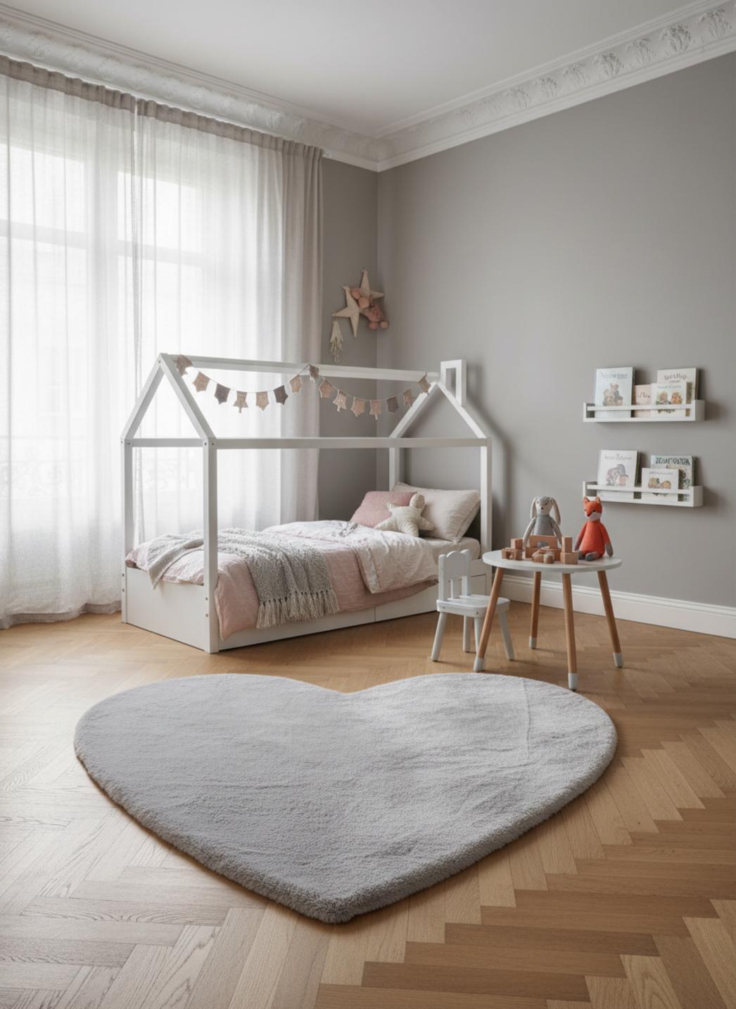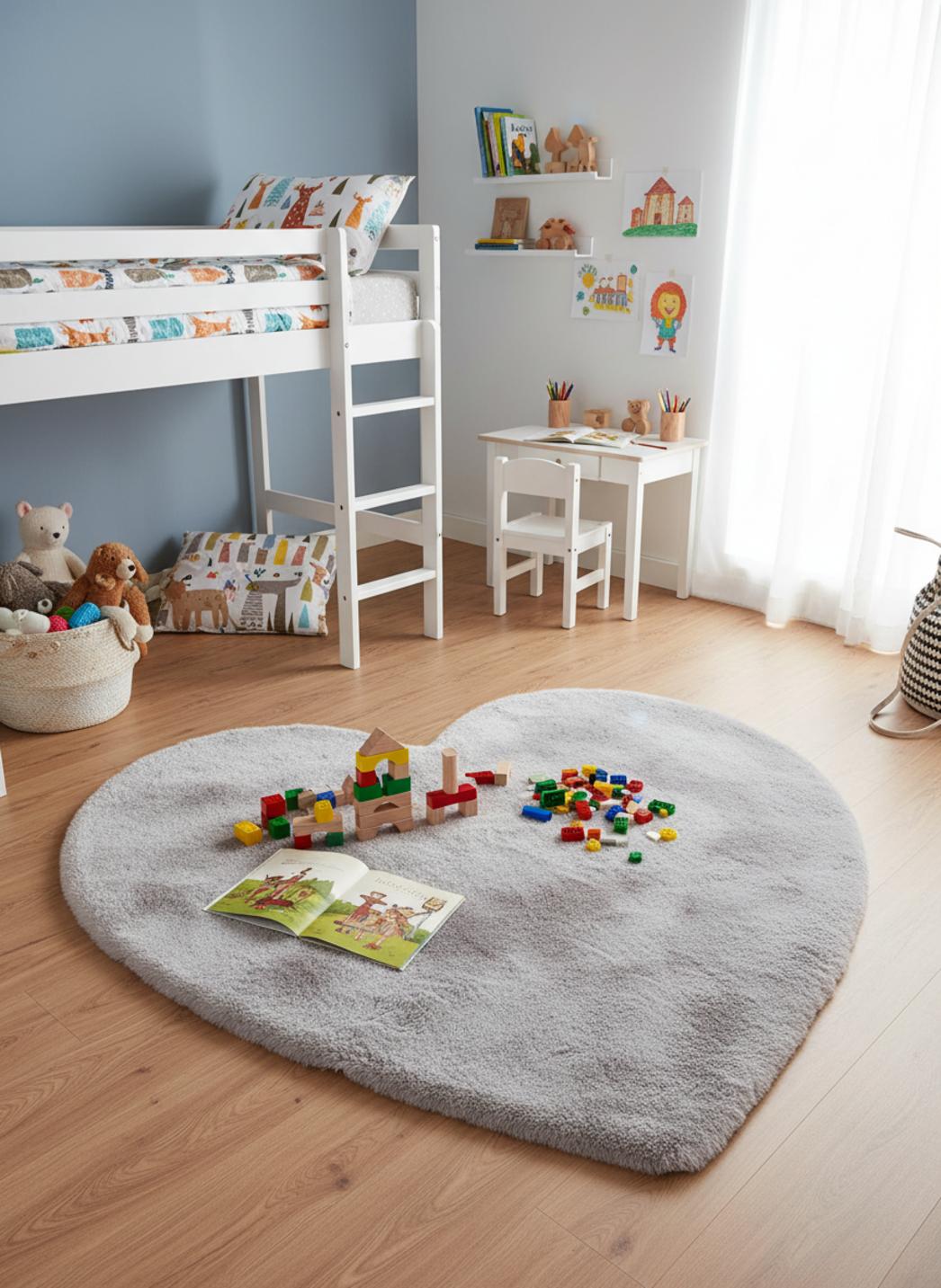 En après-midi, ce tapis devient le théâtre des lectures partagées et des histoires murmurées avant la sieste : un cœur protecteur qui semble dire « ici, il est bien ». La forme en coeur souligne ce rôle de cocon affectueux et transforme un simple coin lecture en lieu de confidences et de jeux tranquilles, pensé spécialement pour l’univers de votre enfant.