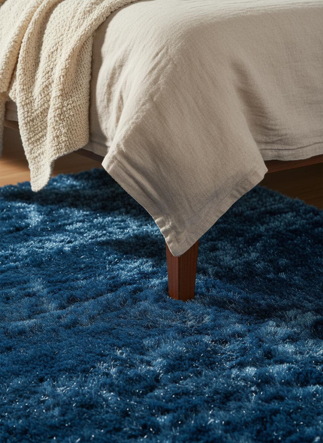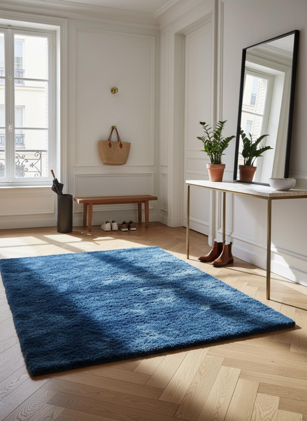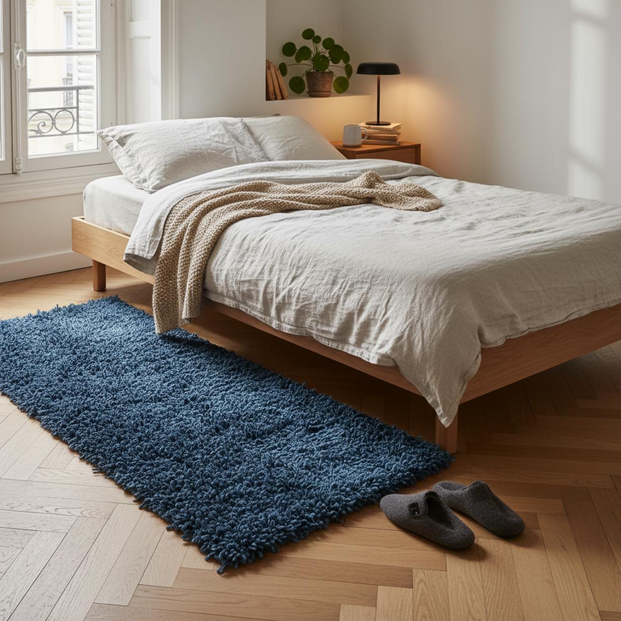 Sa présence visuelle ne s’impose pas, elle s’installe. Le rendu monochrome et profond du bleu s’harmonise avec une décoration hygge ou une approche minimaliste, et crée une scène chaleureuse autour d’un canapé clair ou d’un lit bas. En situation, ce tapis transforme un coin lecture en refuge, apporte une assise douce au pied du lit et structure l’espace sans le charger.
