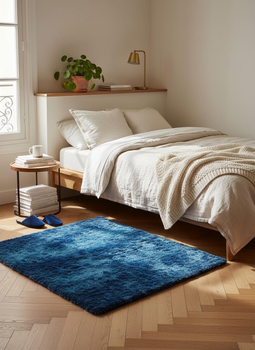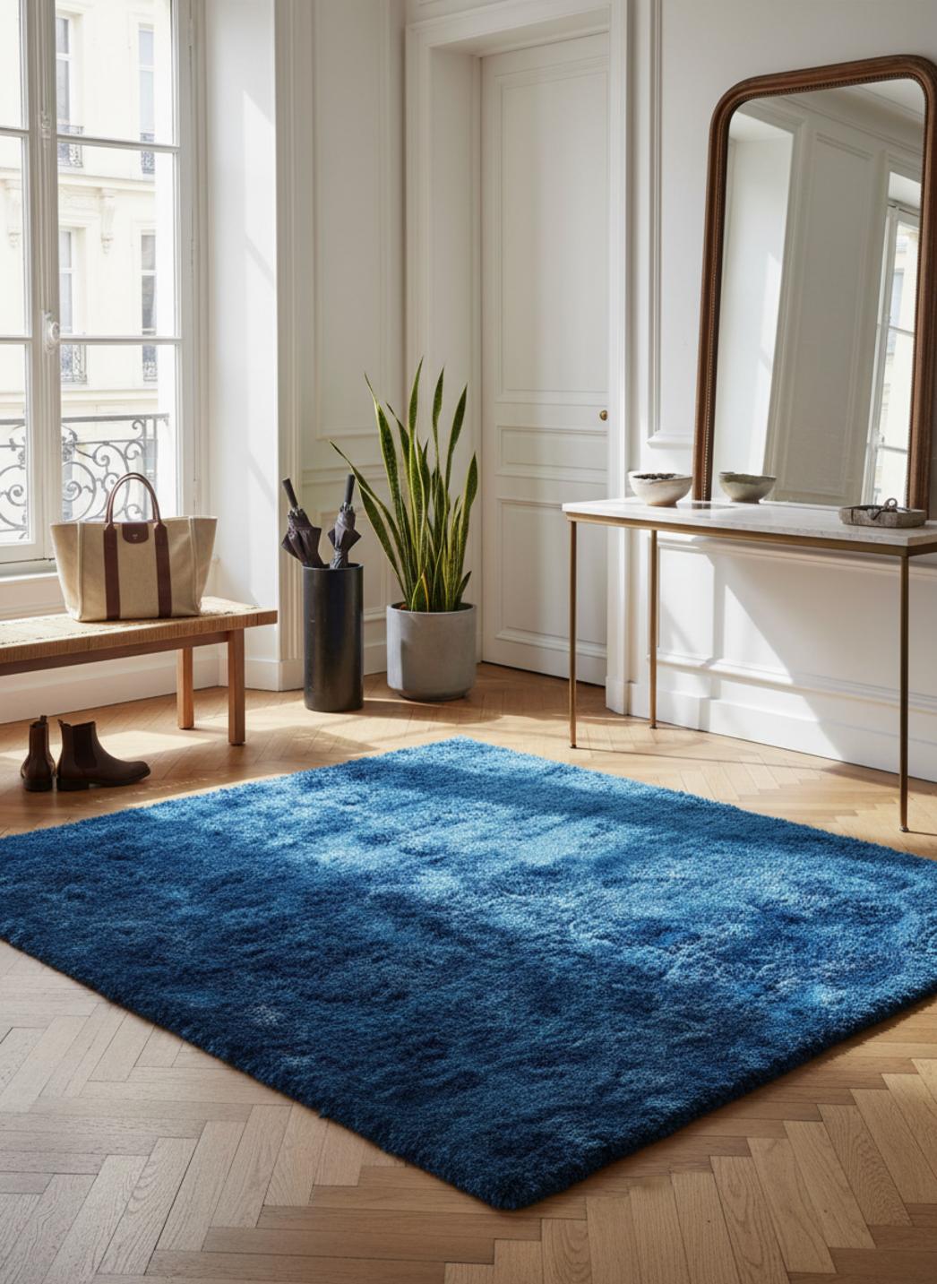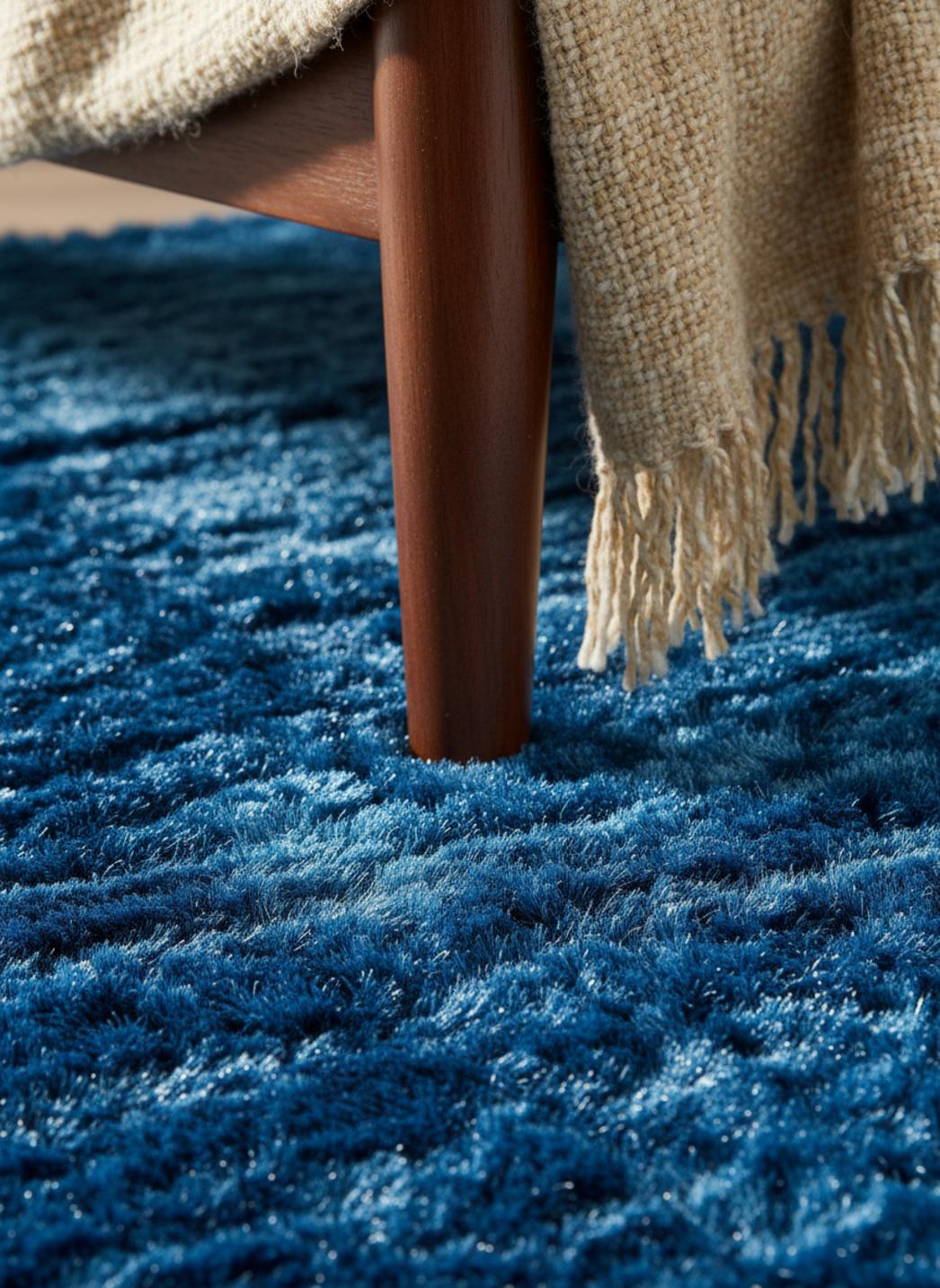 Sous la première caresse, la matière révèle une profondeur de douceur qui invite à s’attarder : les fibres longues reproduisent l’allure d’une douce fourrure, tandis que la densité généreuse offre un moelleux qui épouse le pied. Le velouté se prolonge dans la teinte, un bleu apaisant qui capte la lumière sans jamais crier, créant une présence visuelle raffinée et chaleureuse.