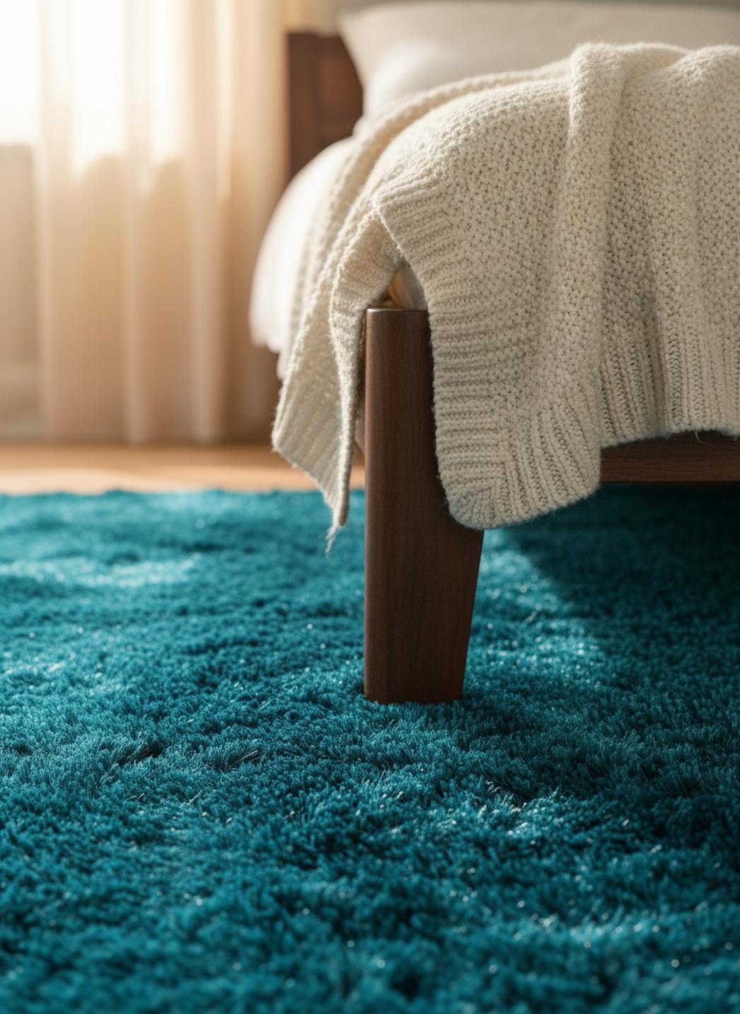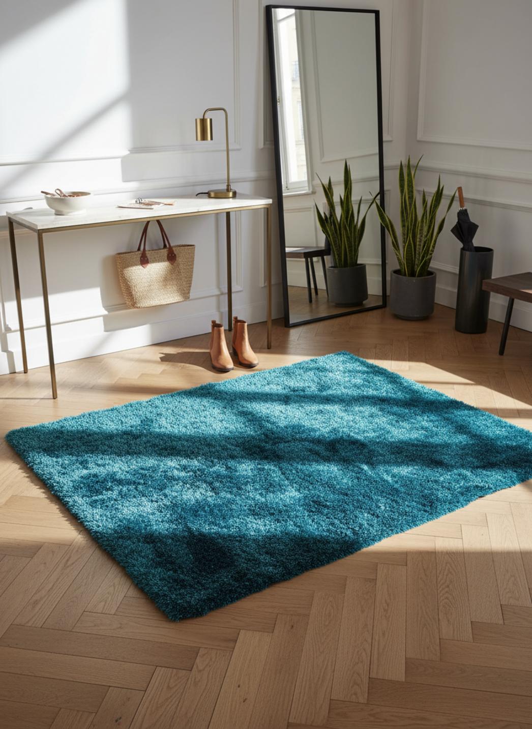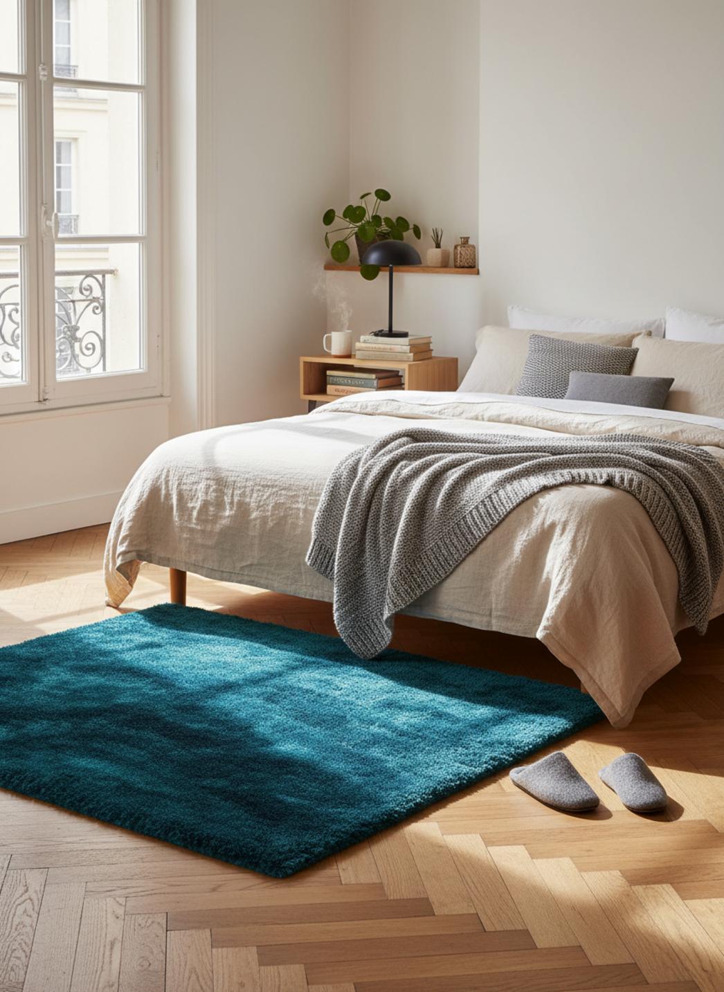 Sous les pieds, la chaleur se diffuse doucement, transformant les gestes quotidiens en petites parenthèses de confort. L’épaisseur généreuse absorbe les bruits, atténue les pas et apporte une présence visuelle apaisante, rehaussée par la teinte profonde du bleu pétrole qui ajoute une nuance chic et mystérieuse, à la fois contemporaine et chaleureuse.