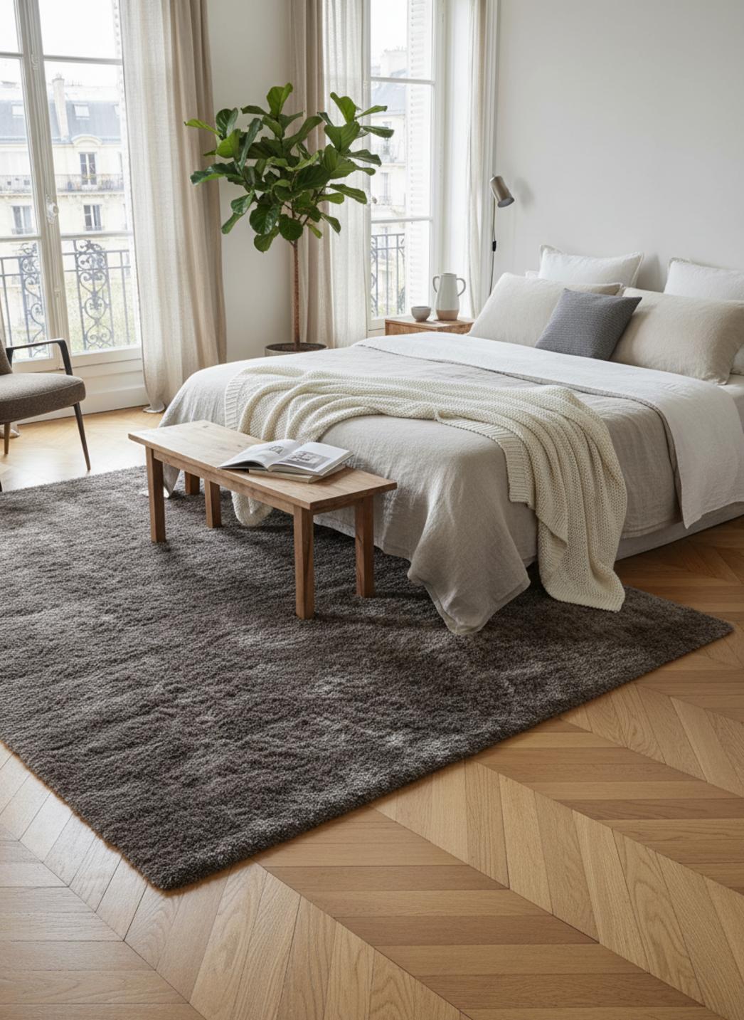 Chaque pas se fait plus feutré grâce à une épaisseur généreuse qui améliore l’absorption sonore et réduit les résonances de la pièce. Le tapis agit comme un filtre thermique et acoustique : il isole, réchauffe et invite au ralentissement, transformant l’écho d’un espace en une atmosphère plus intime et plus douce.